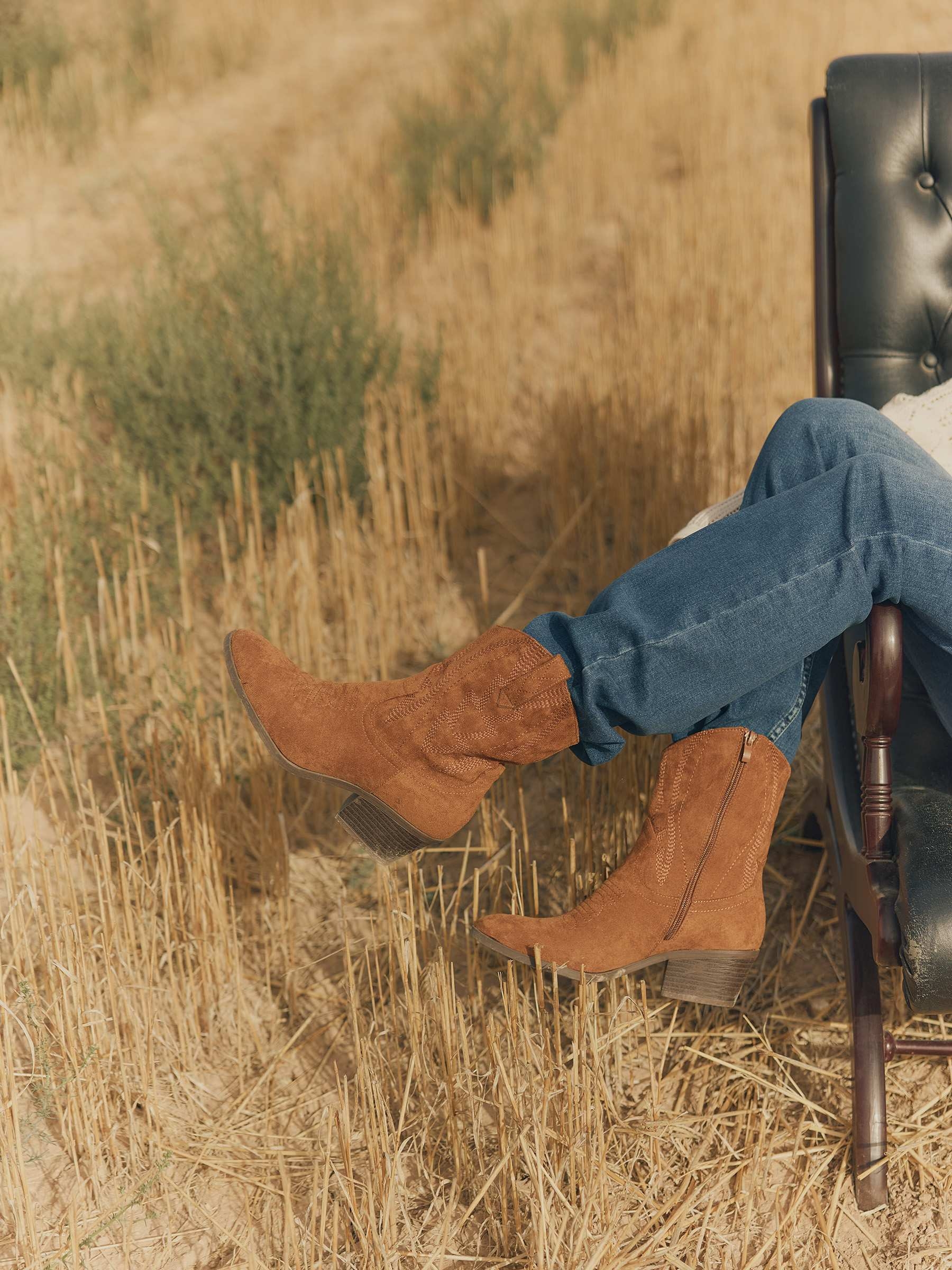 These brown cowboy boots are a basic model for a modern wardrobe. Made of faux leather with a matte finish that mimics suede. They have a classic design with a wide heel that provides comfort. Additionally, they feature side straps that make them easy to put on. Perfect for pairing with jeans or dresses.