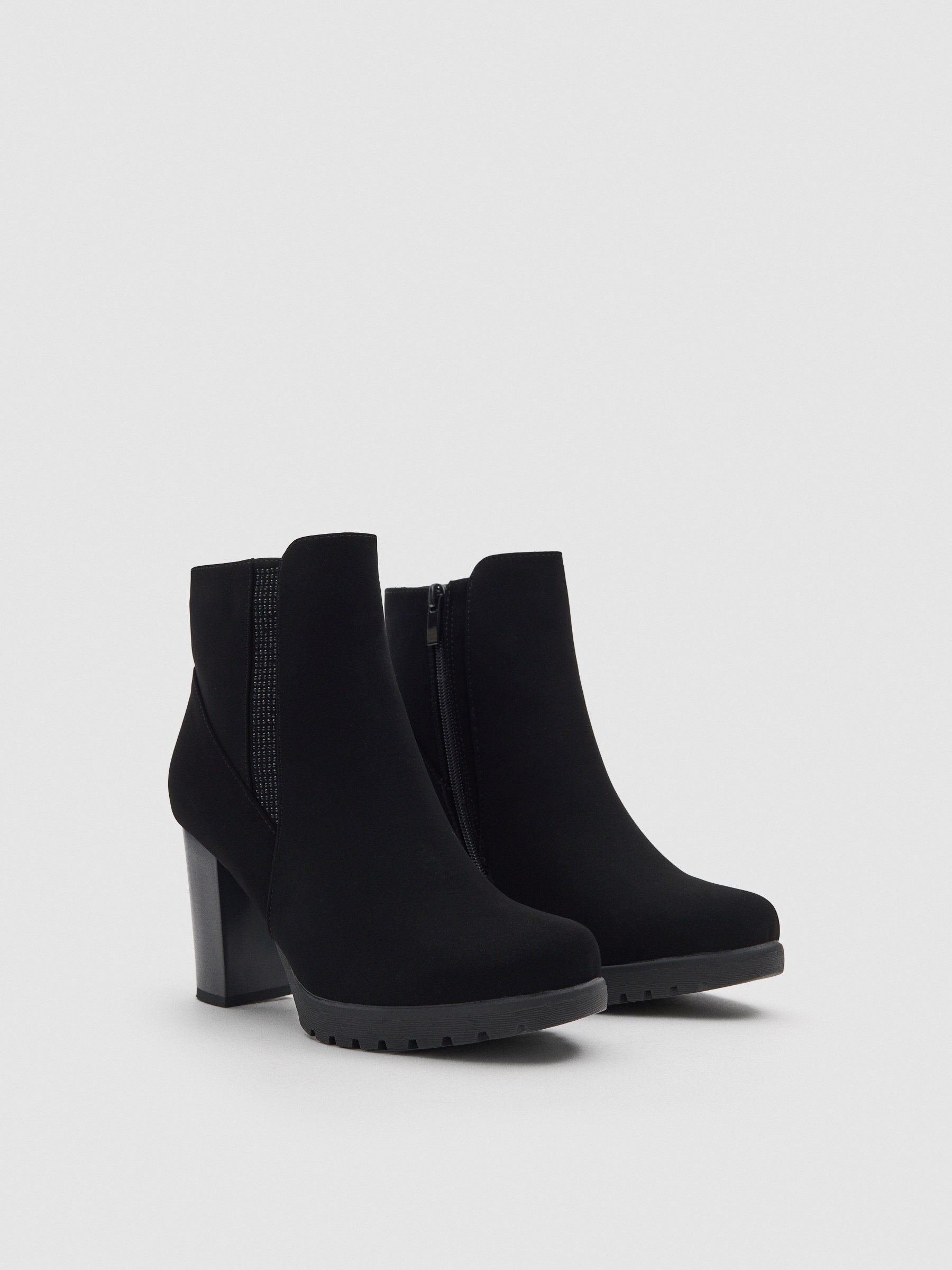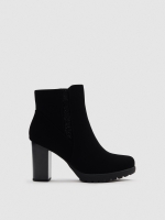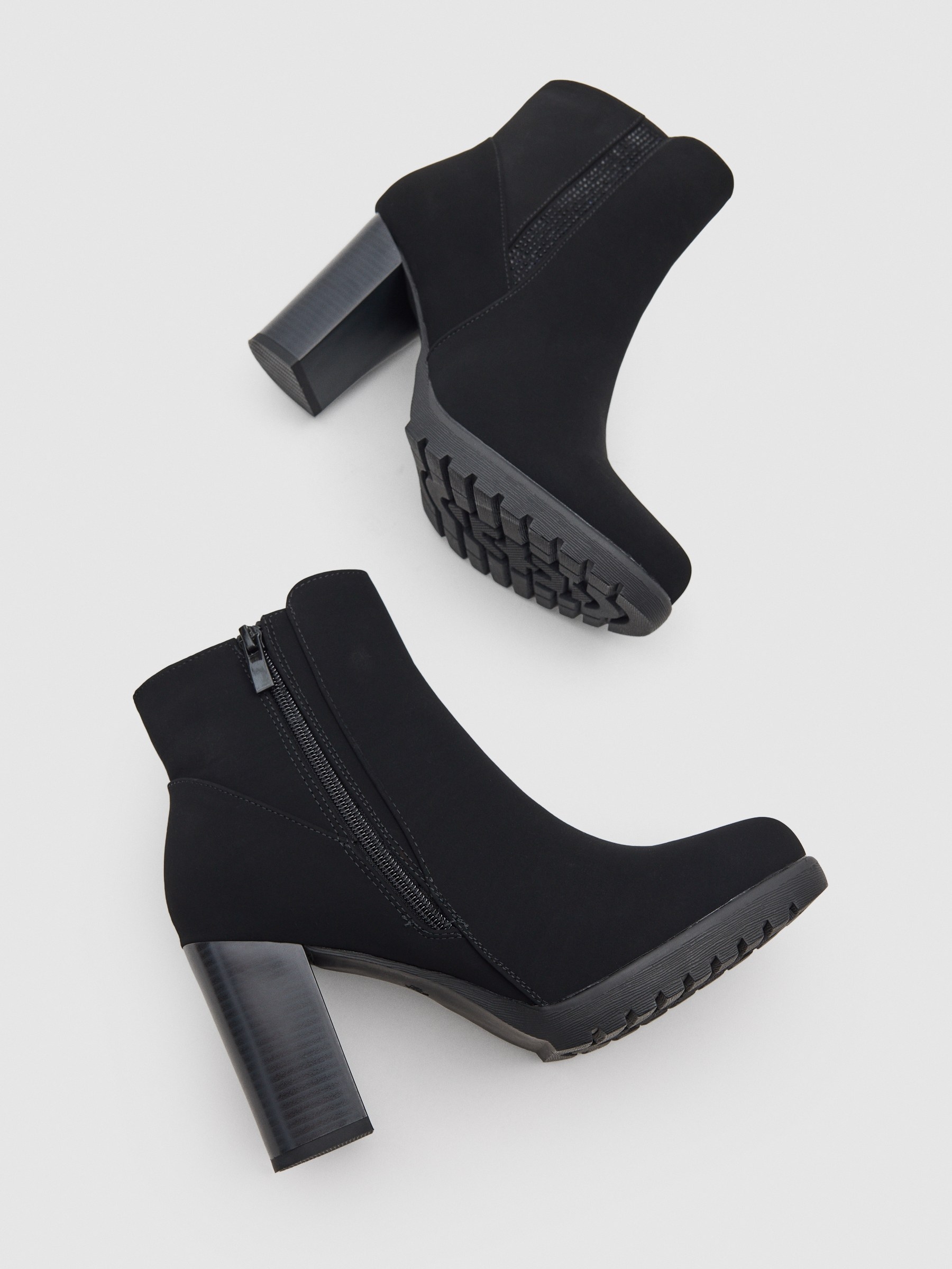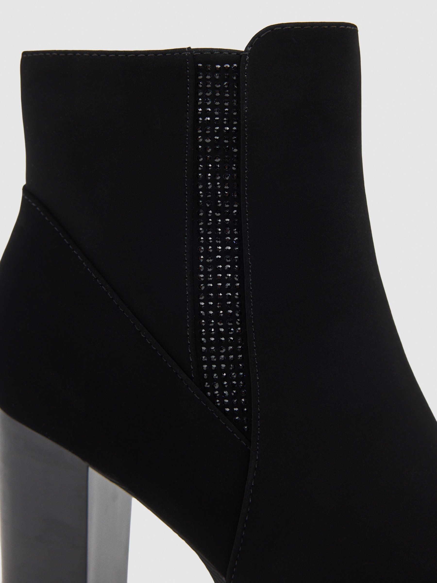 High-heeled boots in black color. Rhinestone detail with shine on the shaft. Side zipper closure. Platform sole.