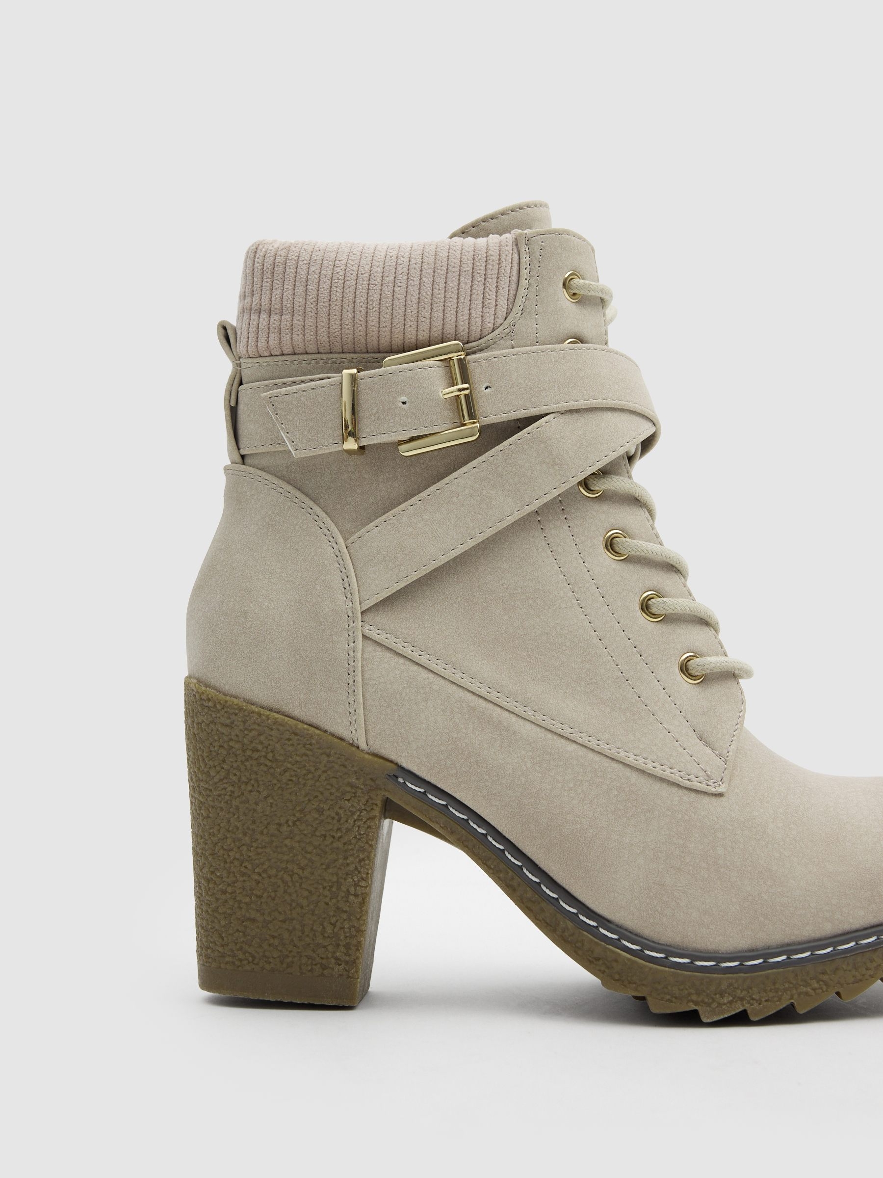 Heeled ankle boots made with faux leather fabric. Front lace-up closure and buckle adjustment. Track sole. Finished with a round toe.