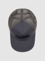Dark gray trucker cap, with a structured front and mesh back. It features a raised embroidered logo on the front and a curved visor with visible stitching. Adjustable back closure.