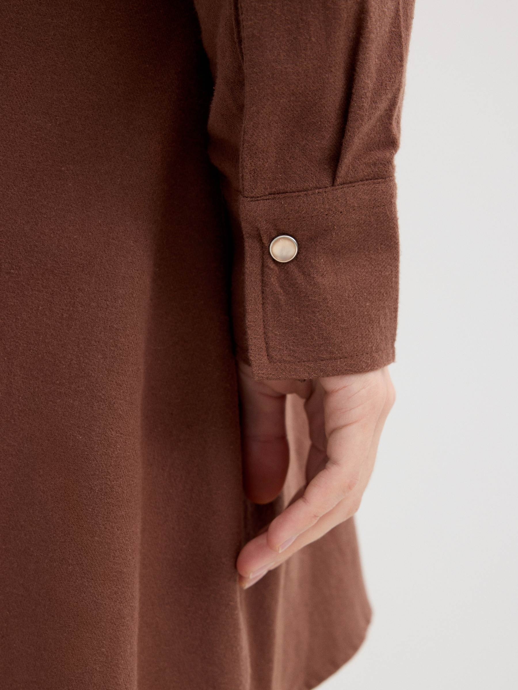 Mini shirt dress with a plain design, made of viscose flat fabric. Placket closure with buttons that adds a classic touch with long sleeves and a shirt collar. Flared cut.