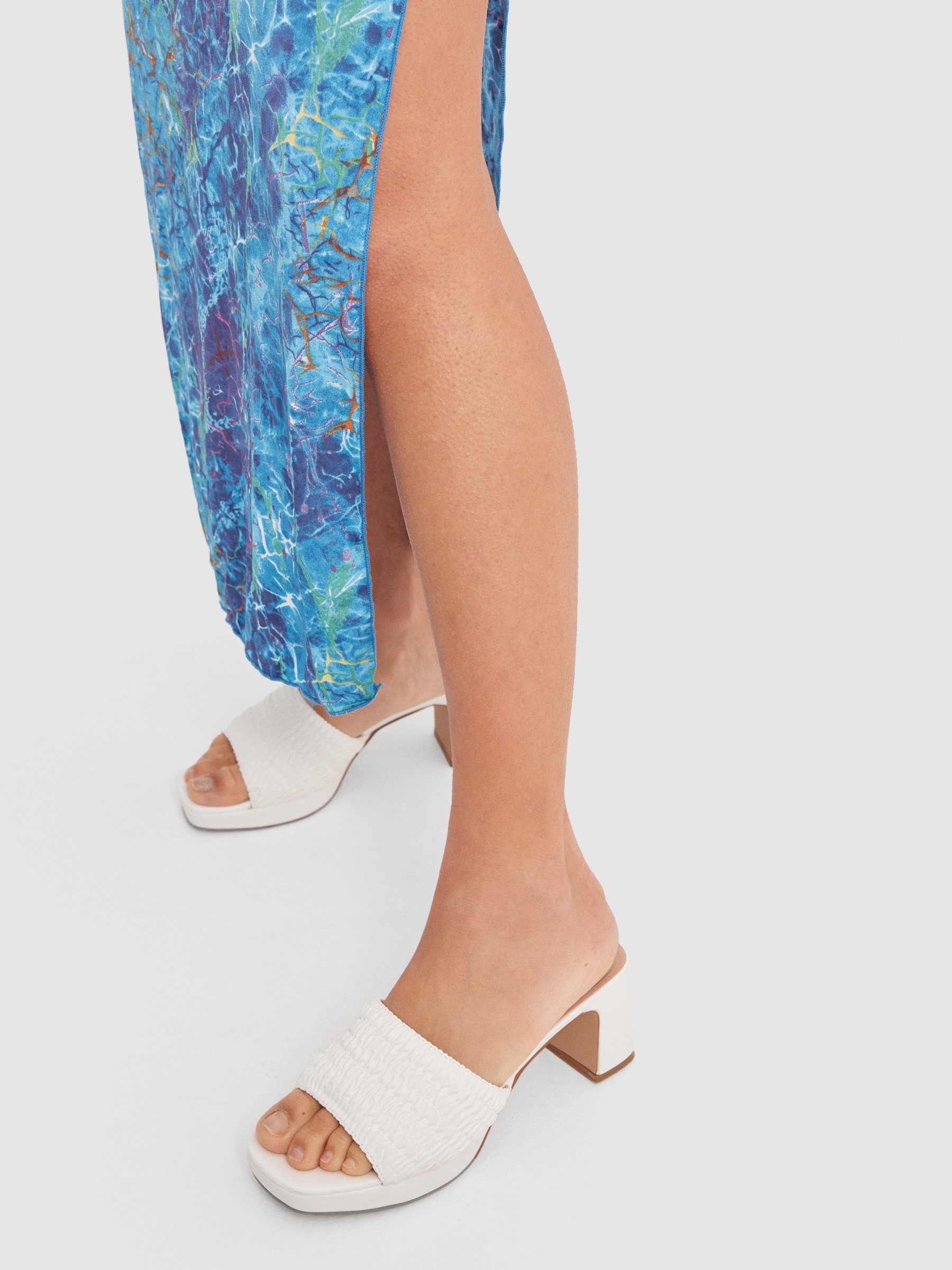 Take summer fashion to the next level with this tie dye print maxi dress. Made from knitted fabric. Sleeveless with a gathered neckline at the bust fastened with a metal ring. Knotted straps at the neck. Fitted cut with slit at the sides.