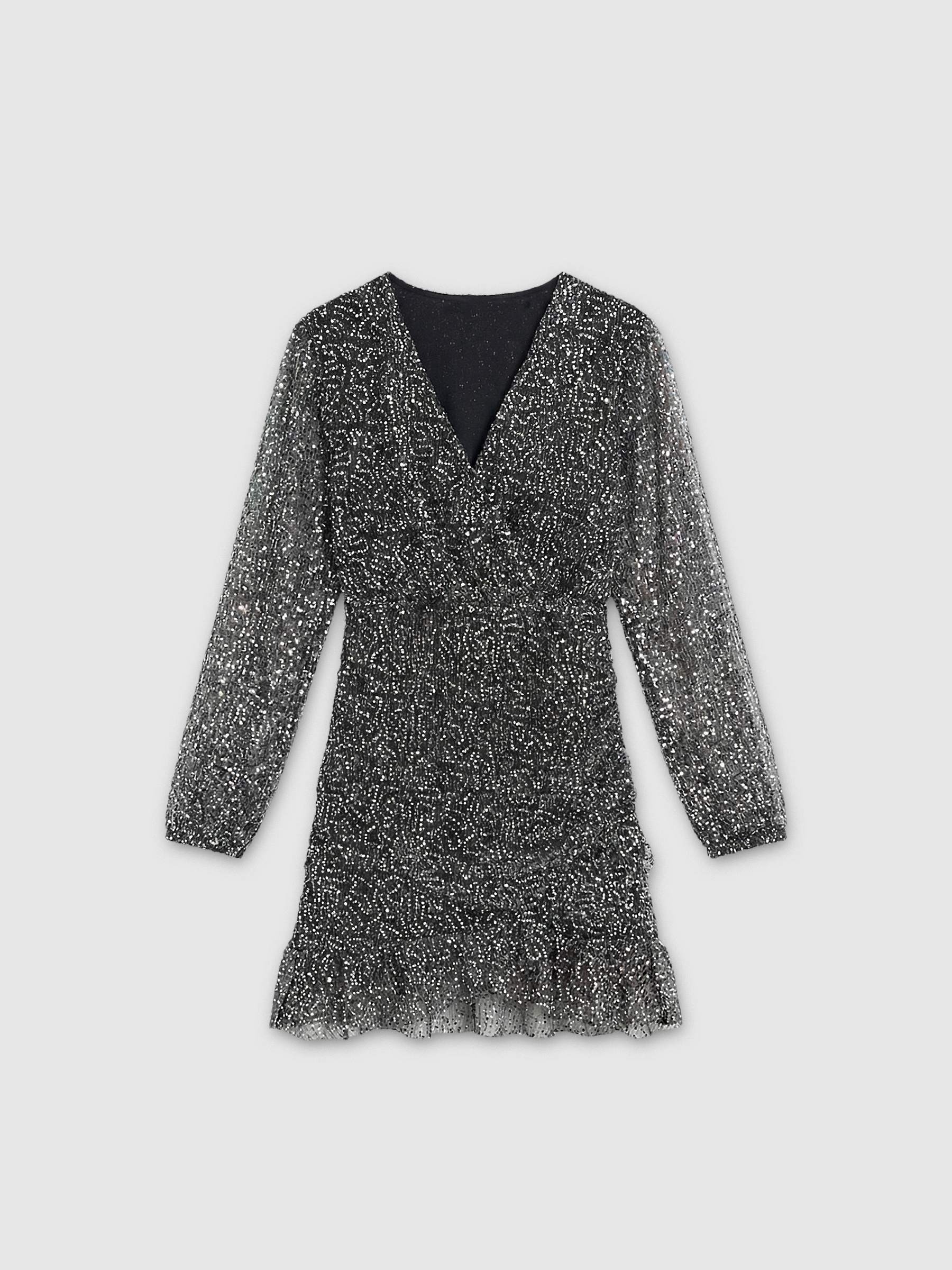 Mini dress with long balloon sleeves with elastic, made in semi-transparent fabric with inner lining, printed with sequins. Slim fit, crossover body with V-neckline, crossover skirt finished with ruffle and ruffled detail on one side.