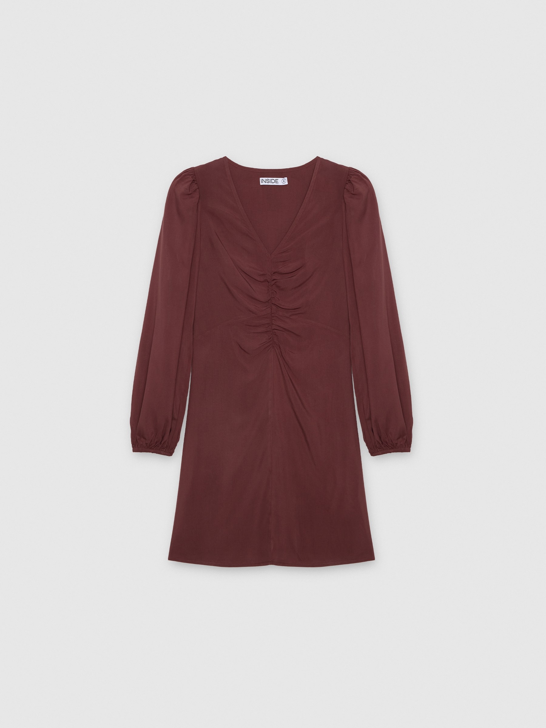 Mini dress with ruched design. Made of viscose fabric, printed and flared cut. V-neck and long sleeves. Perfect for any occasion.