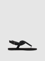 Black thong sandals, designed with crisscrossed nylon straps over the instep that add texture to the design, featuring a toe strap and an adjustable buckle closure at the ankle, its slightly shiny finish adds a striking touch and the flat rubber sole ensures walking comfort.