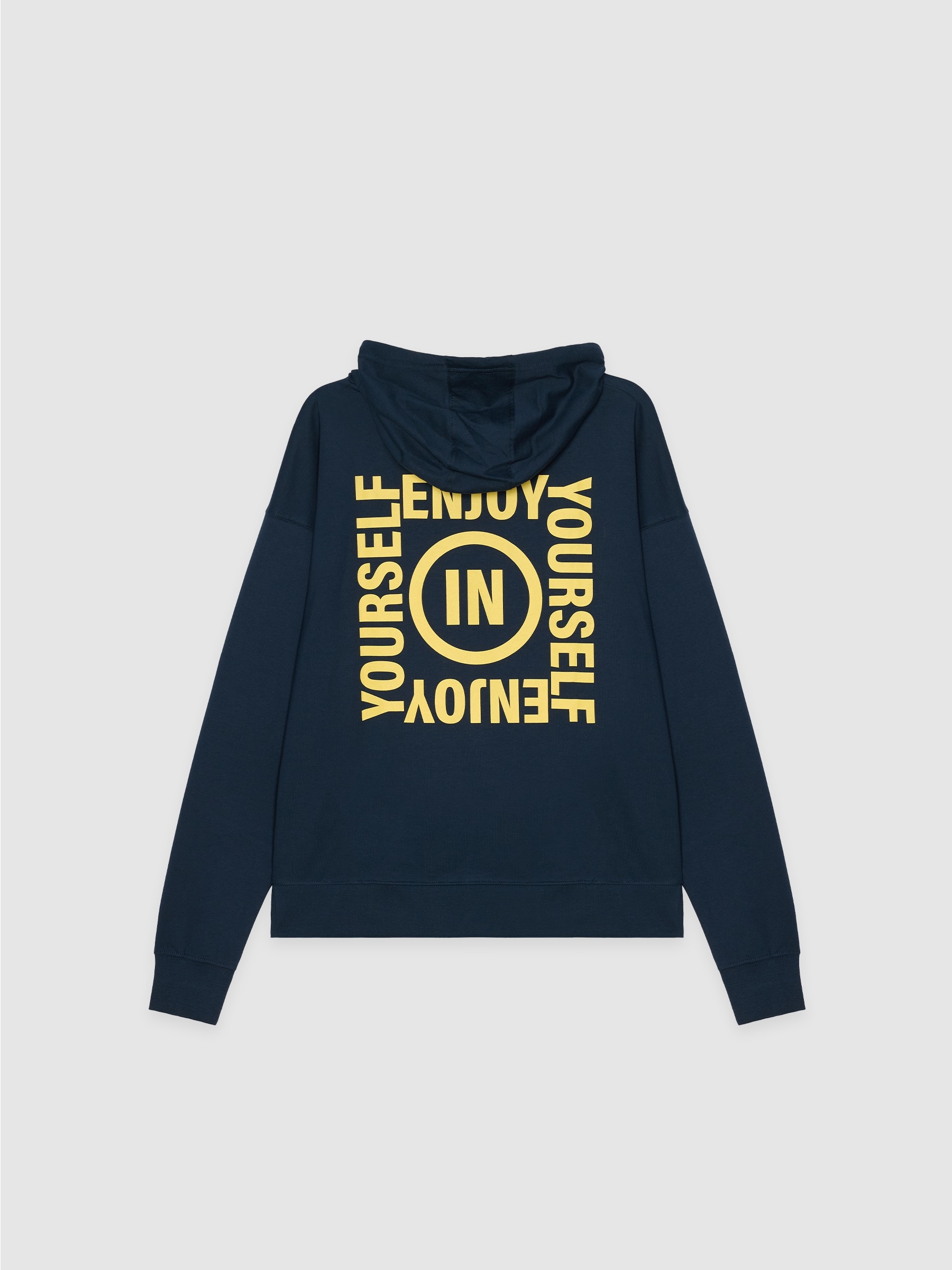 Crew neck sweatshirt with hood and long sleeves. Front kangaroo pocket. Front and back print design. Oversized fit and ribbed finishes.