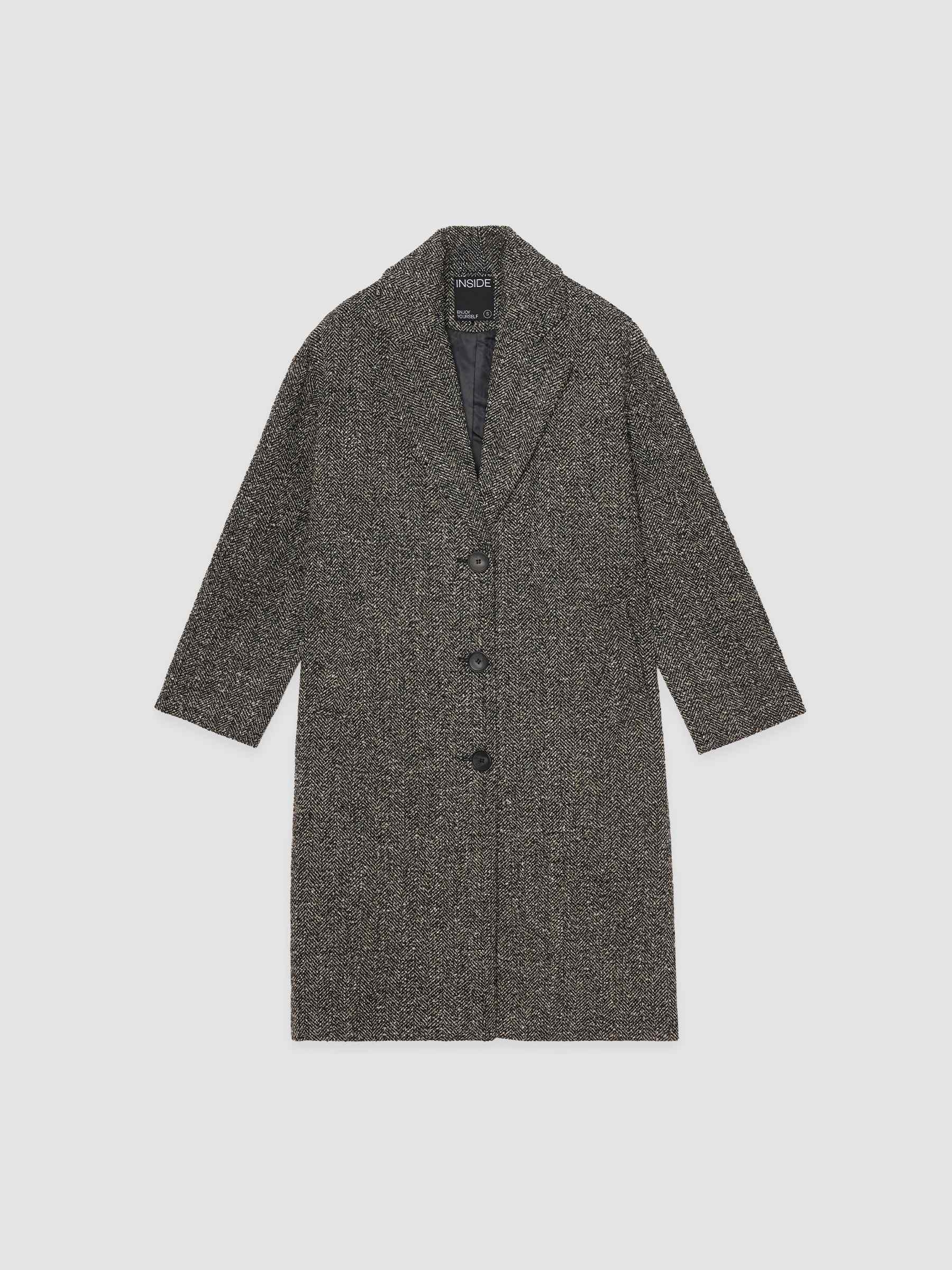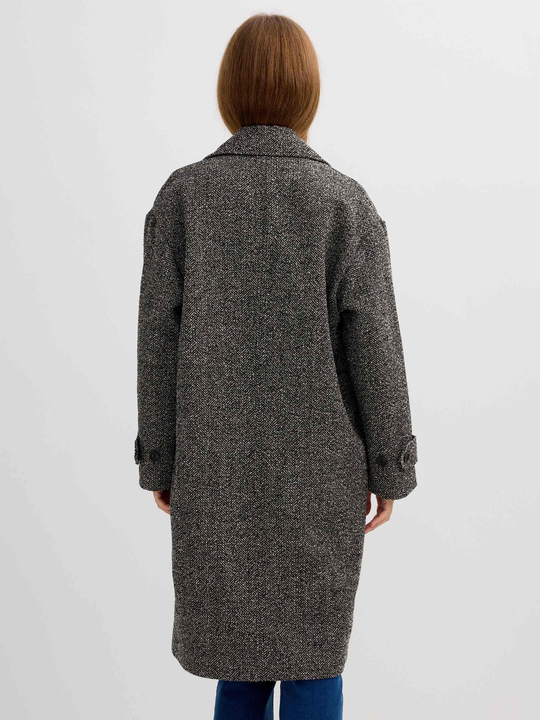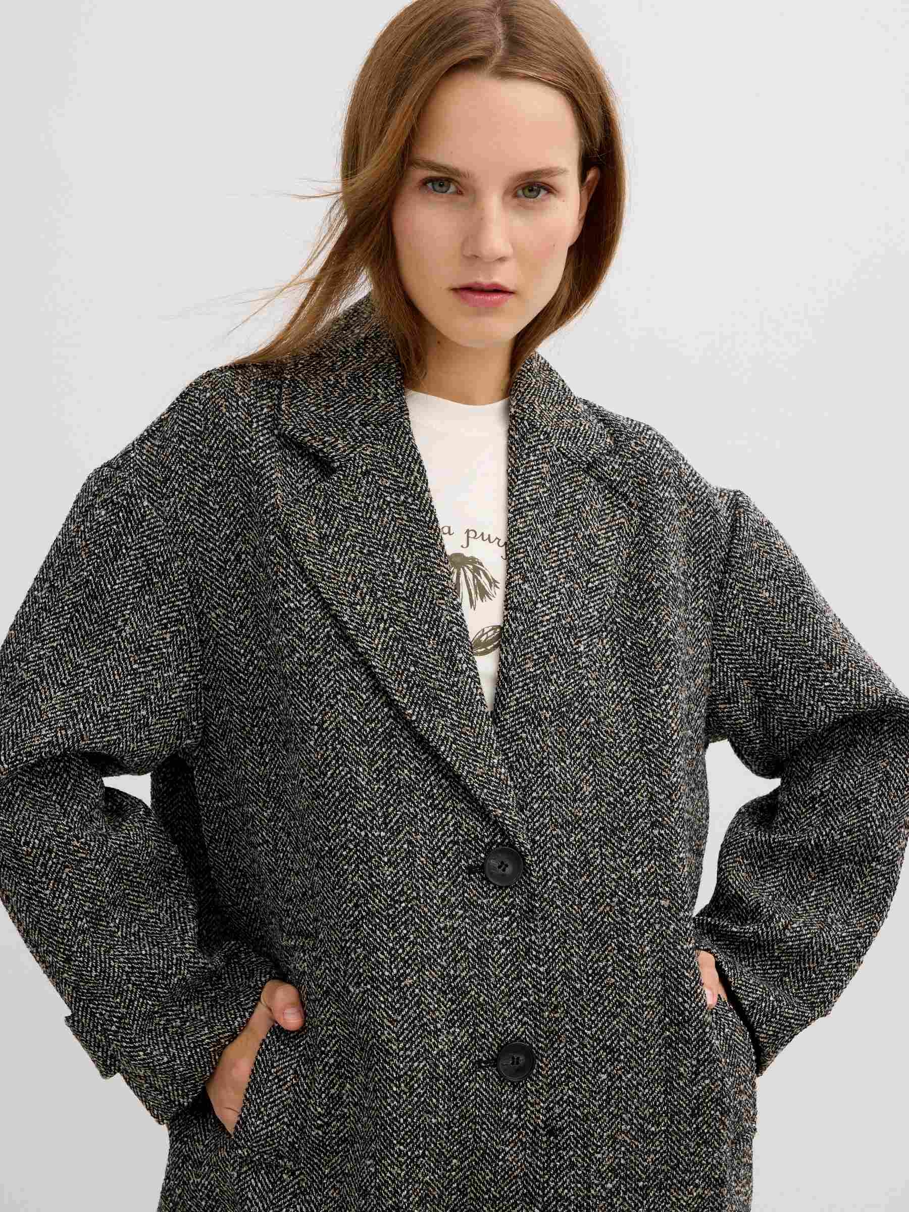 Lapelled collar coat with long sleeves. Front pockets. Front button closure.
