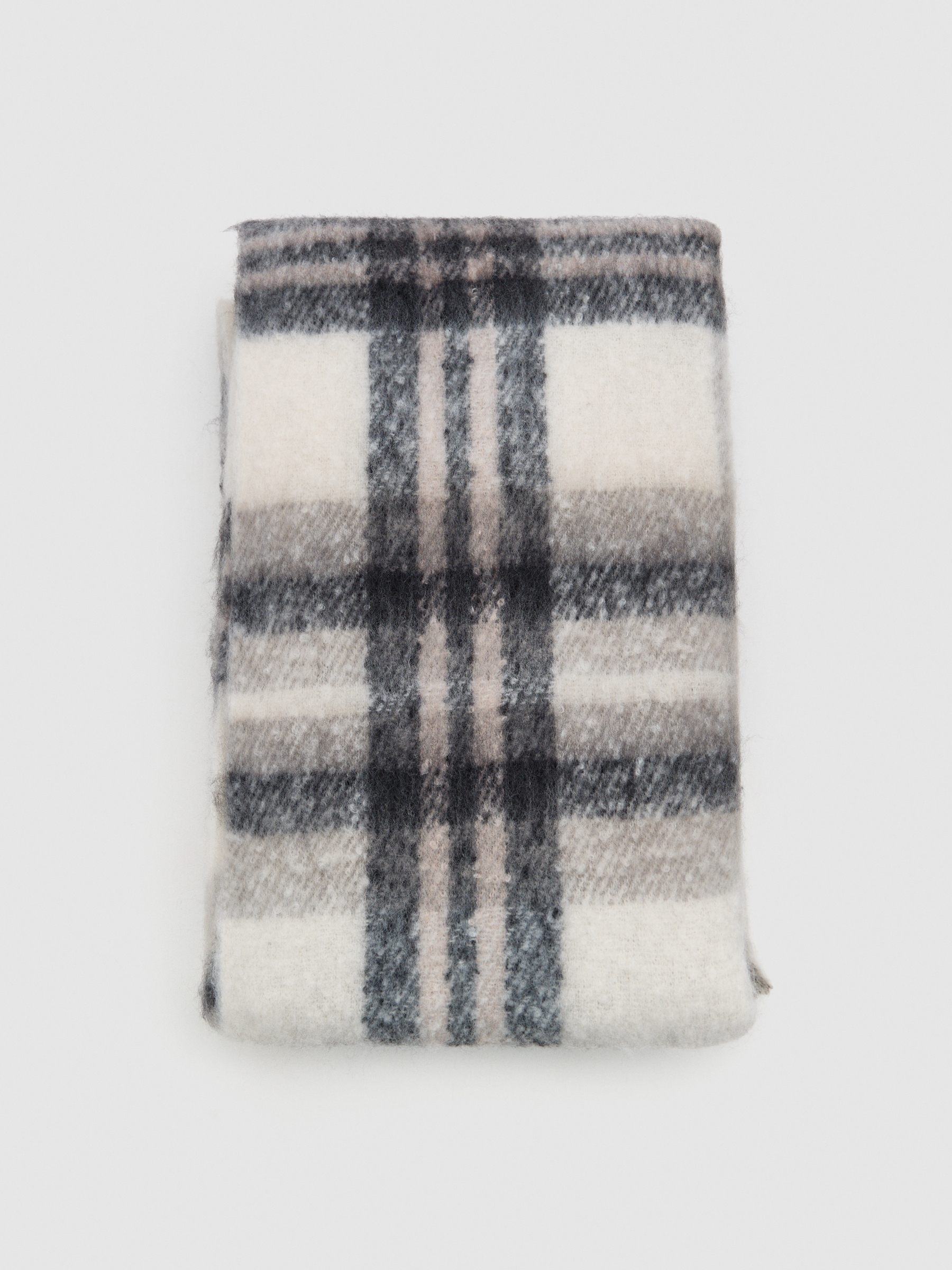 Scarf blanket type with checkered design in neutral tones. Made of soft and warm fabric. Large size that allows multiple ways of use.