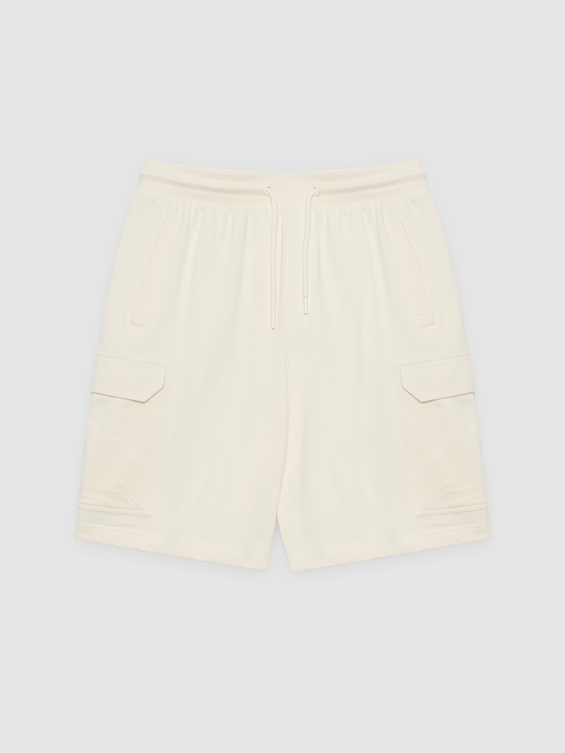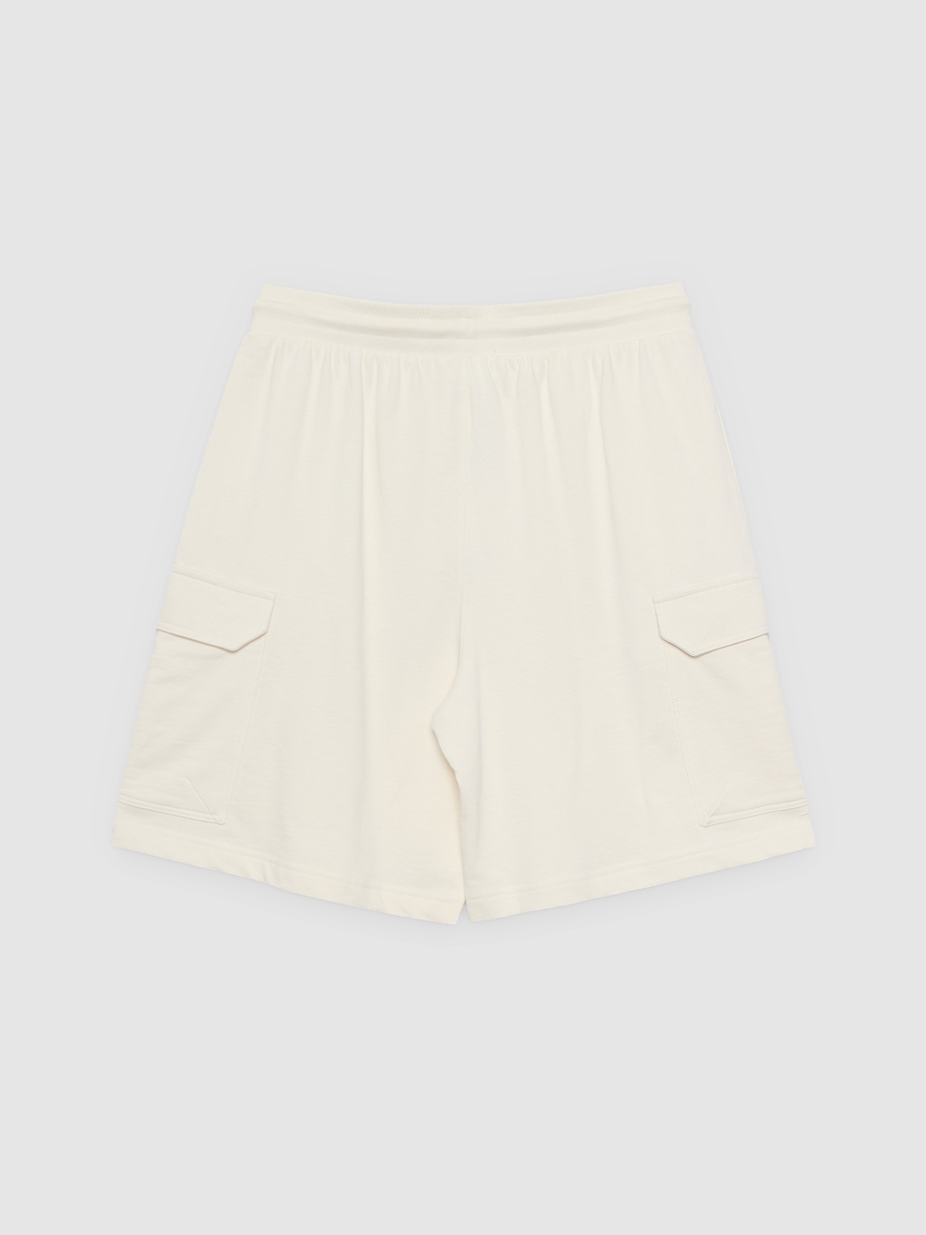 Bermuda cargo shorts in fleece fabric, with a solid print. Elastic waistband with drawstrings and side pockets.
