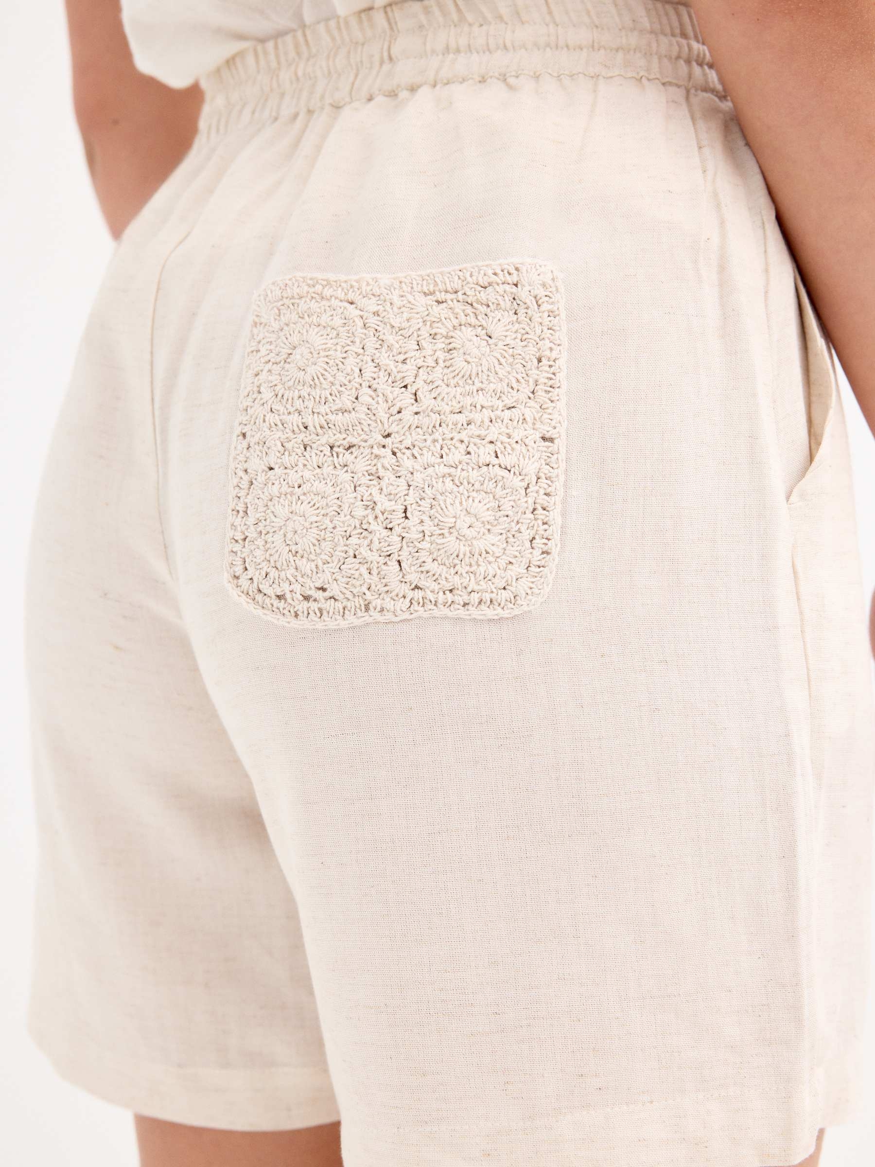 Fluid Bermuda shorts 100% viscose. Side and back crochet pockets. Elastic waistband with adjustable drawstring closure.