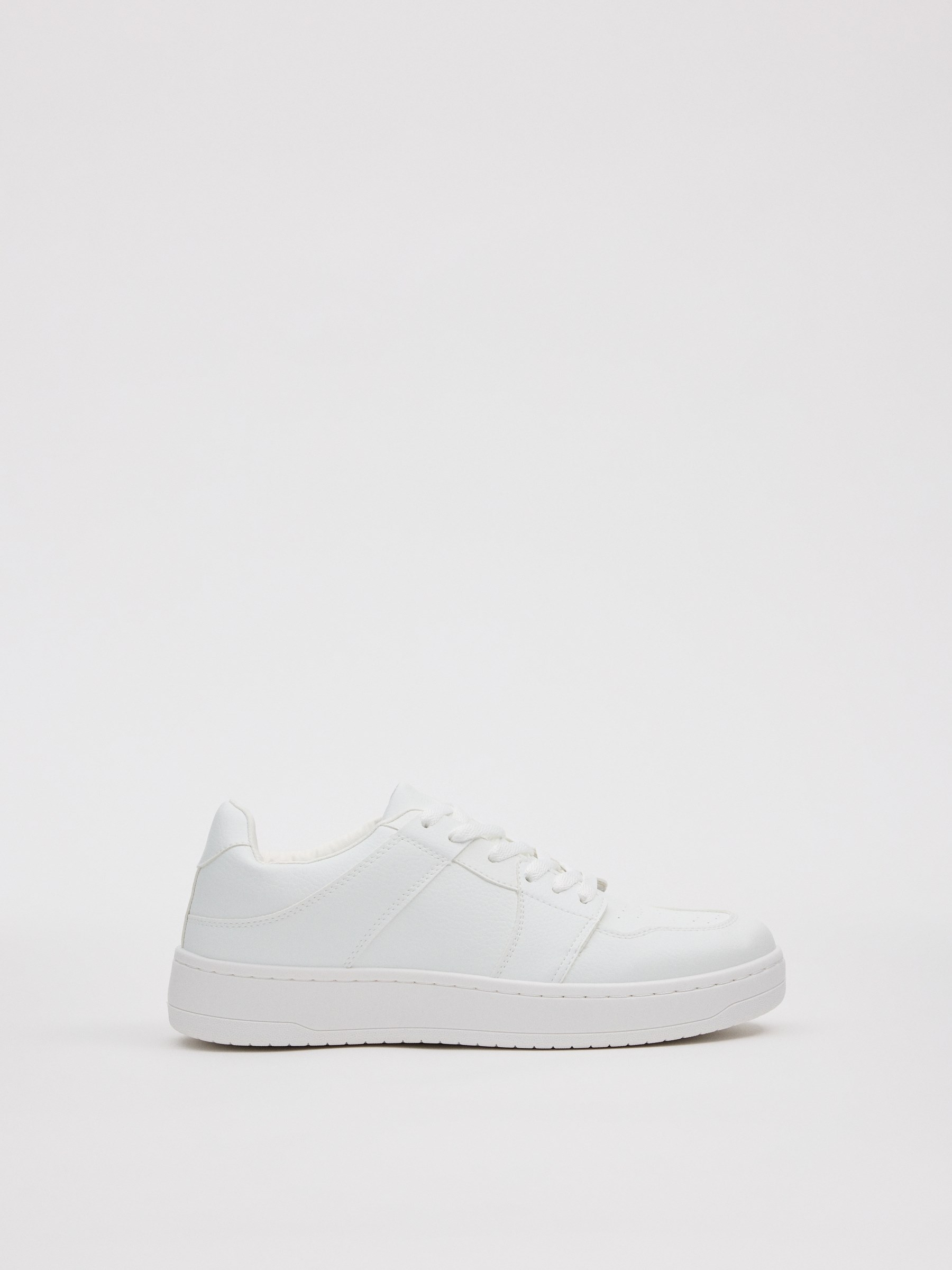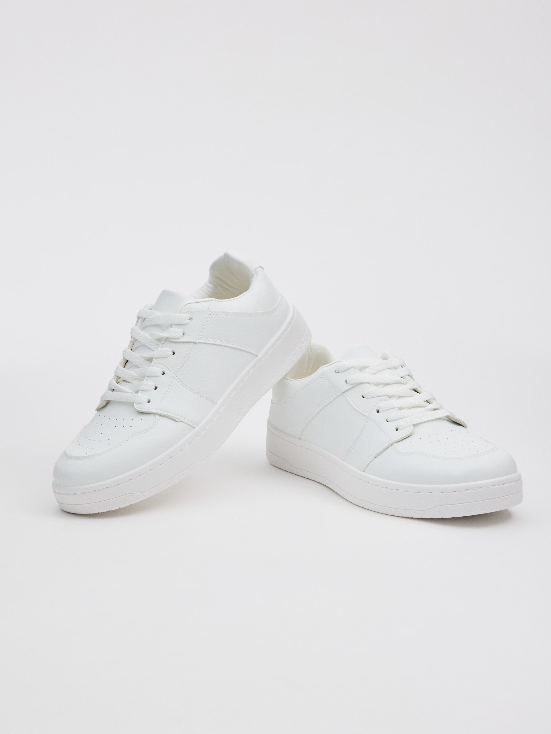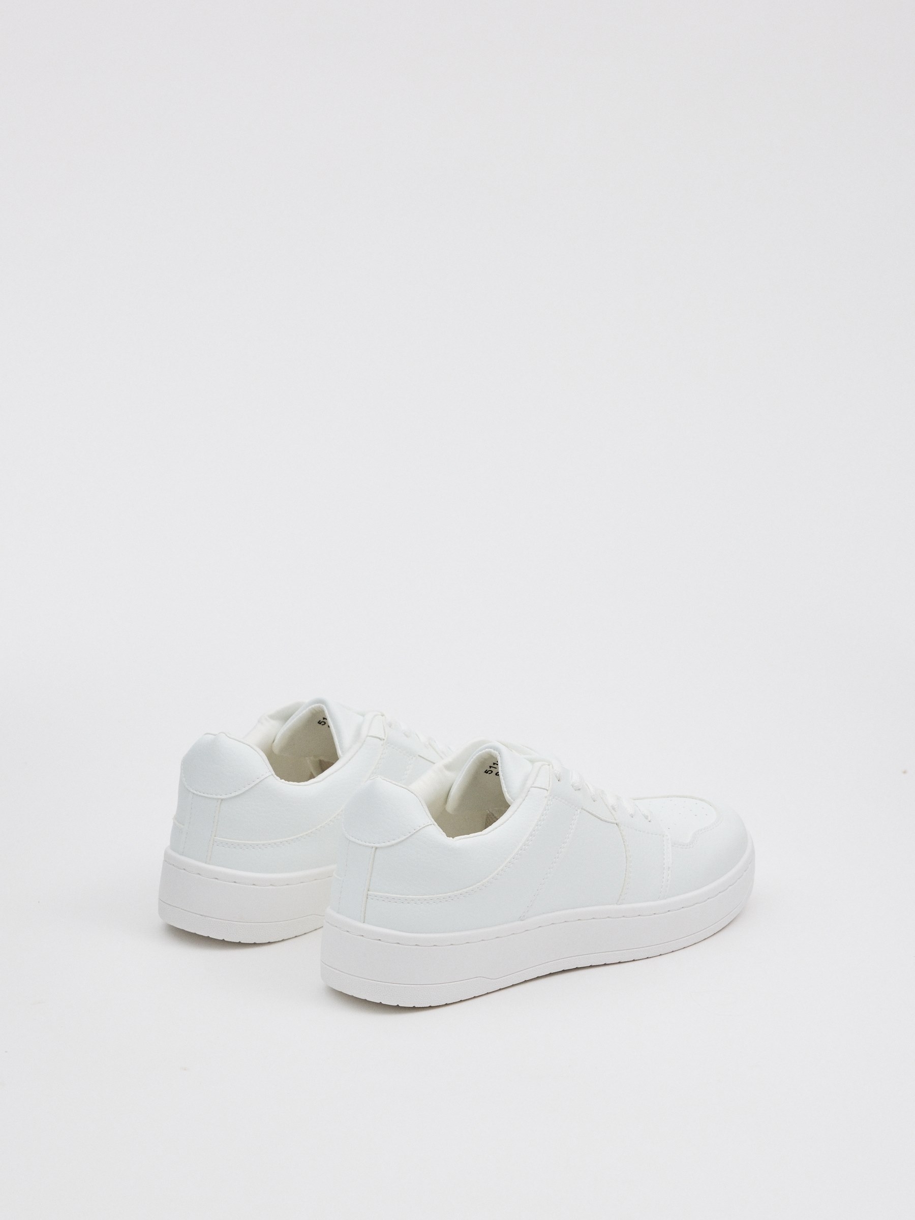 White skater sneakers with a minimalist design in faux leather, ideal for everyday use. Their perforated upper enhances breathability, while the rubber sole provides traction and comfort with every step. A versatile model with lace-up closure, perfect for urban looks.
