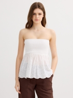 Cotton bandeau top with Swiss embroidery and plain print, finished with a flared hem. Smocked body and elastic closure. Cotton fabric with embroidered effect. .