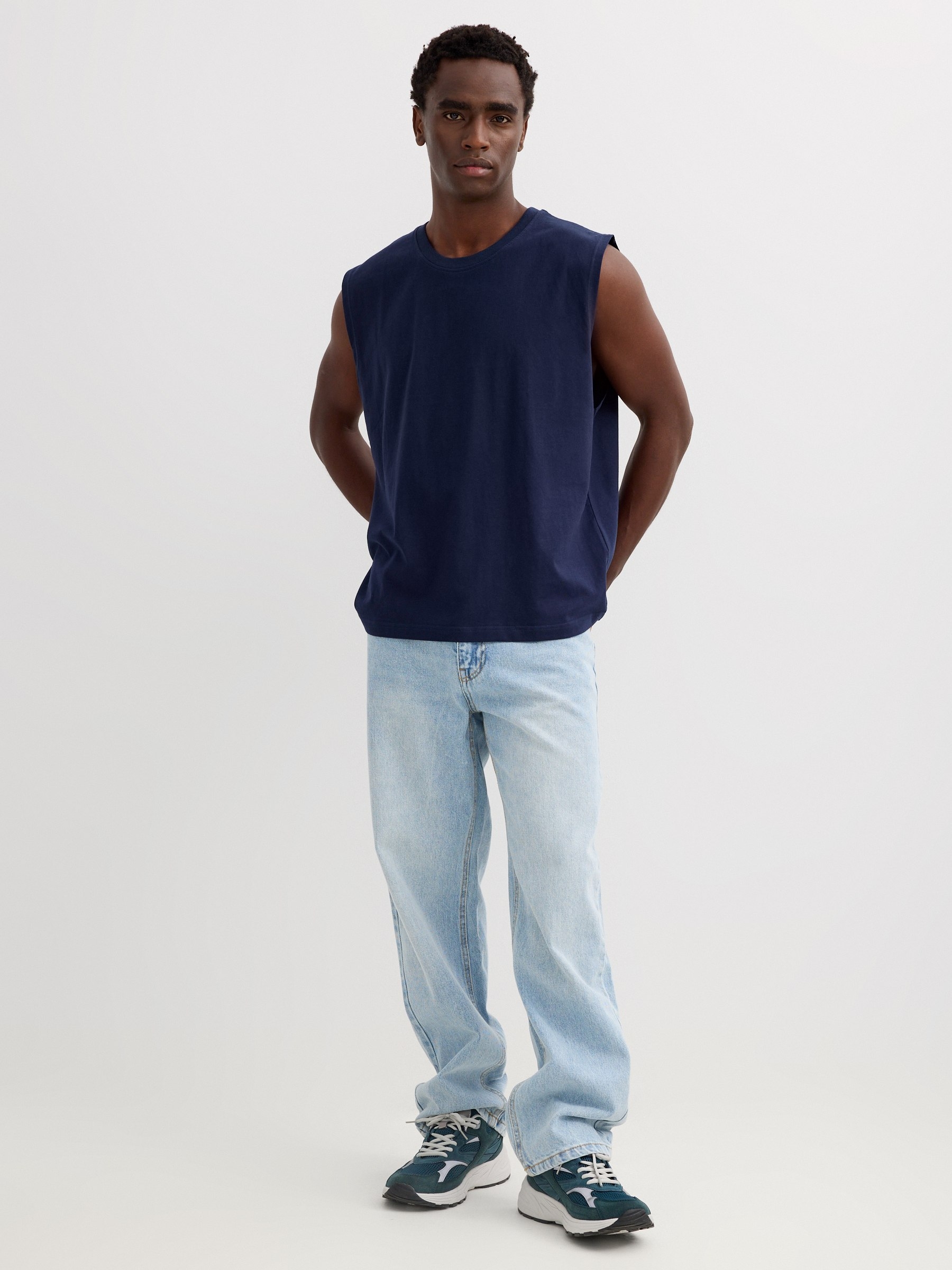 Sleeveless cotton T-shirt with plain print and round neck. Design width 55 cm.