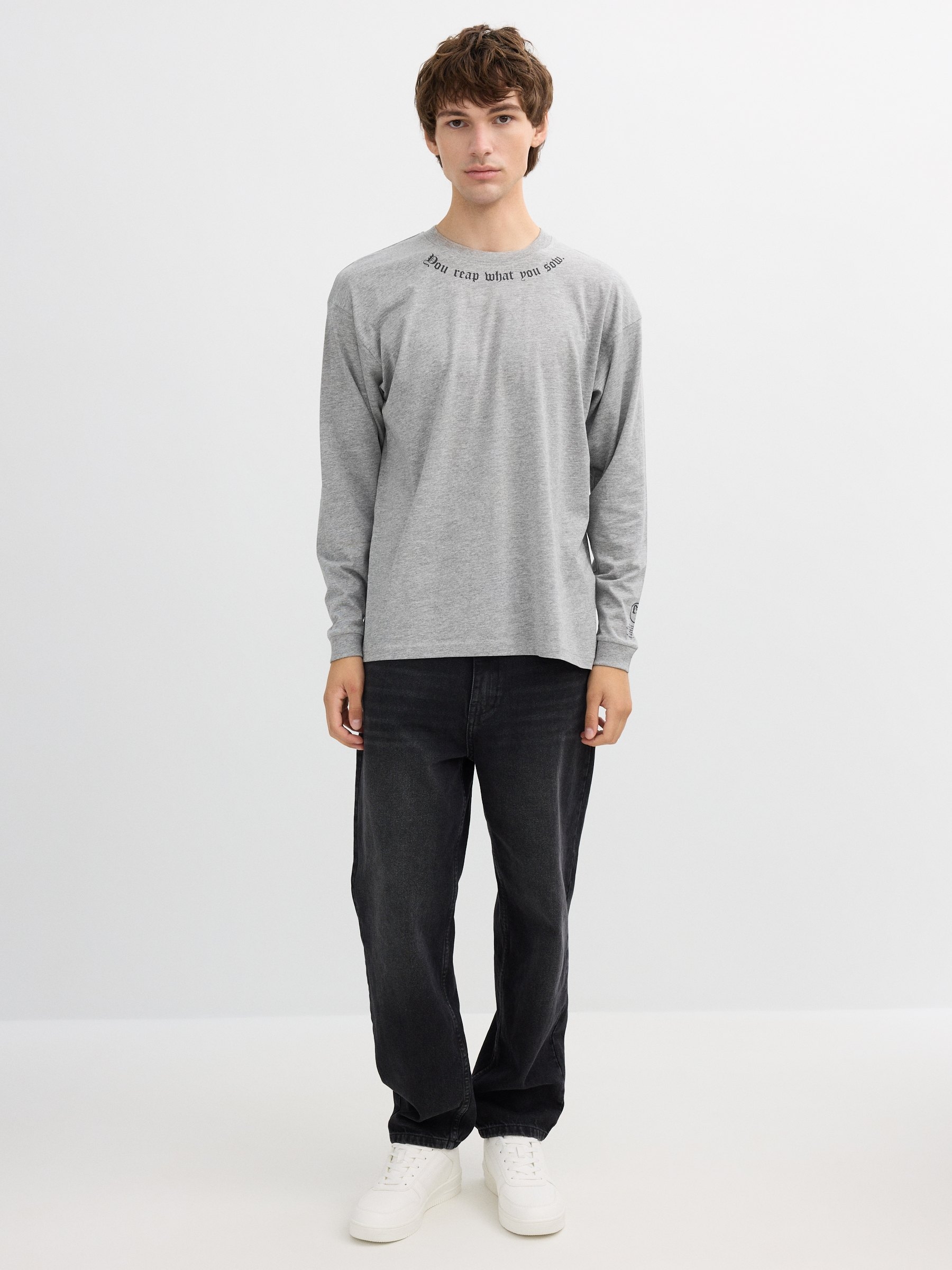 100% cotton long-sleeve T-shirt with a round neck. Front and back text design. Oversized fit. Ribbed finishes.