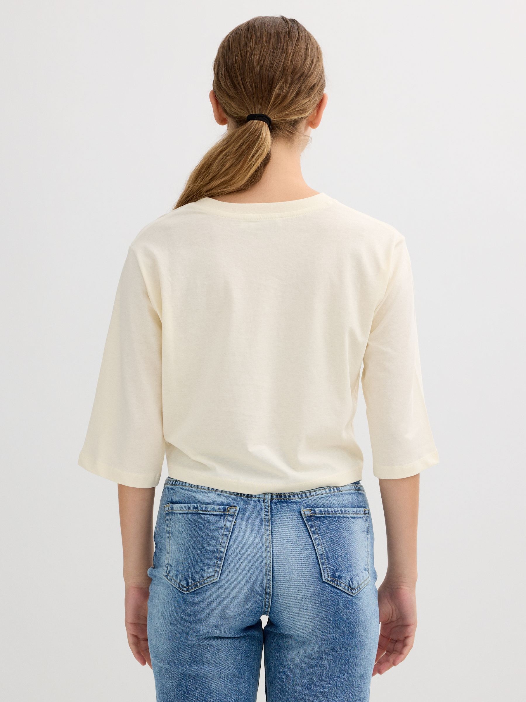 Three-quarter sleeve T-shirt 100% cotton and round neck. Front print with flowers and text.
