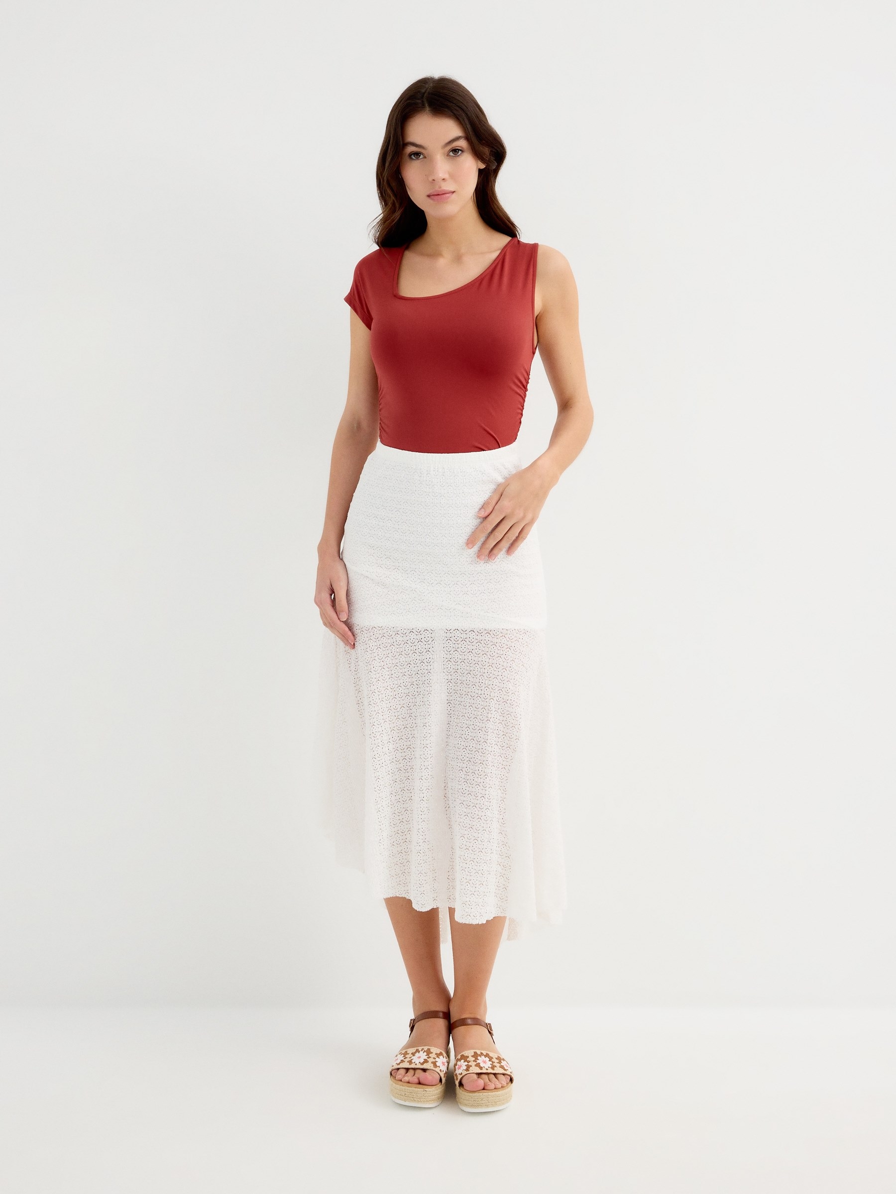 Ruched top with an asymmetric neckline made from a fabric with a soft and stretchy finish. It features a sleeveless design with ruching on the sides that provides a flattering fit. Its asymmetric neckline adds a different touch, ideal for casual looks or more sophisticated combinations.