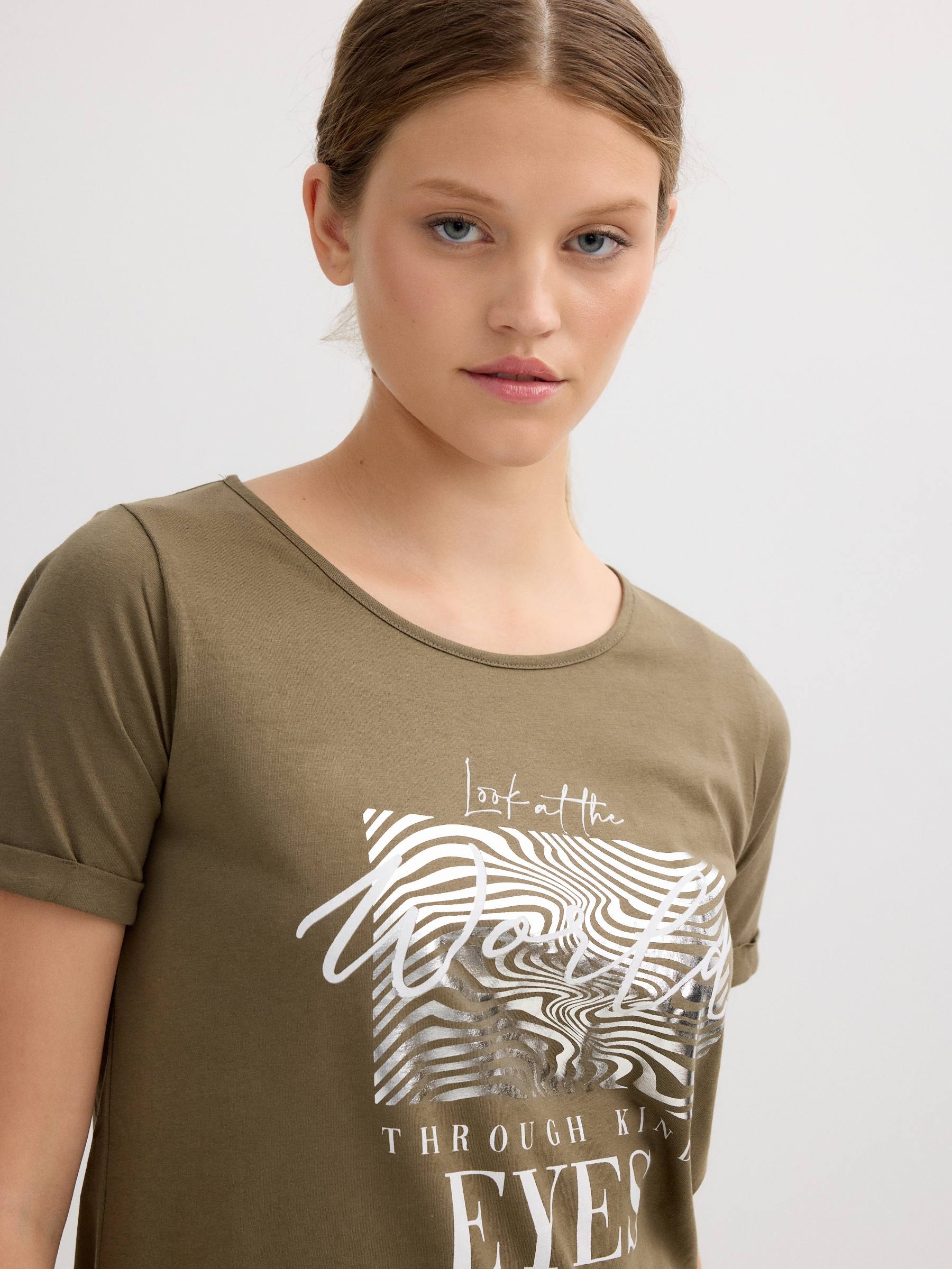 Short-sleeve T-shirt 100% cotton and round neck. Front print combined with text. Regular fit.