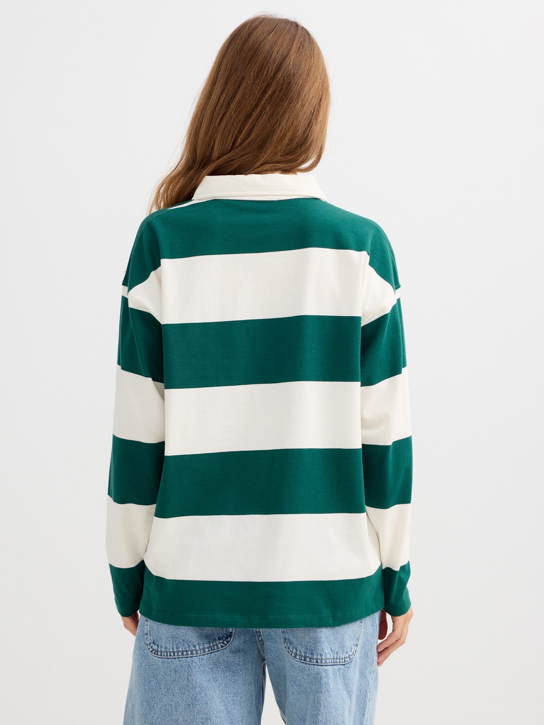 Cotton T-shirt with two-tone striped print and long-sleeve design. Polo collar with button placket and straight cut.