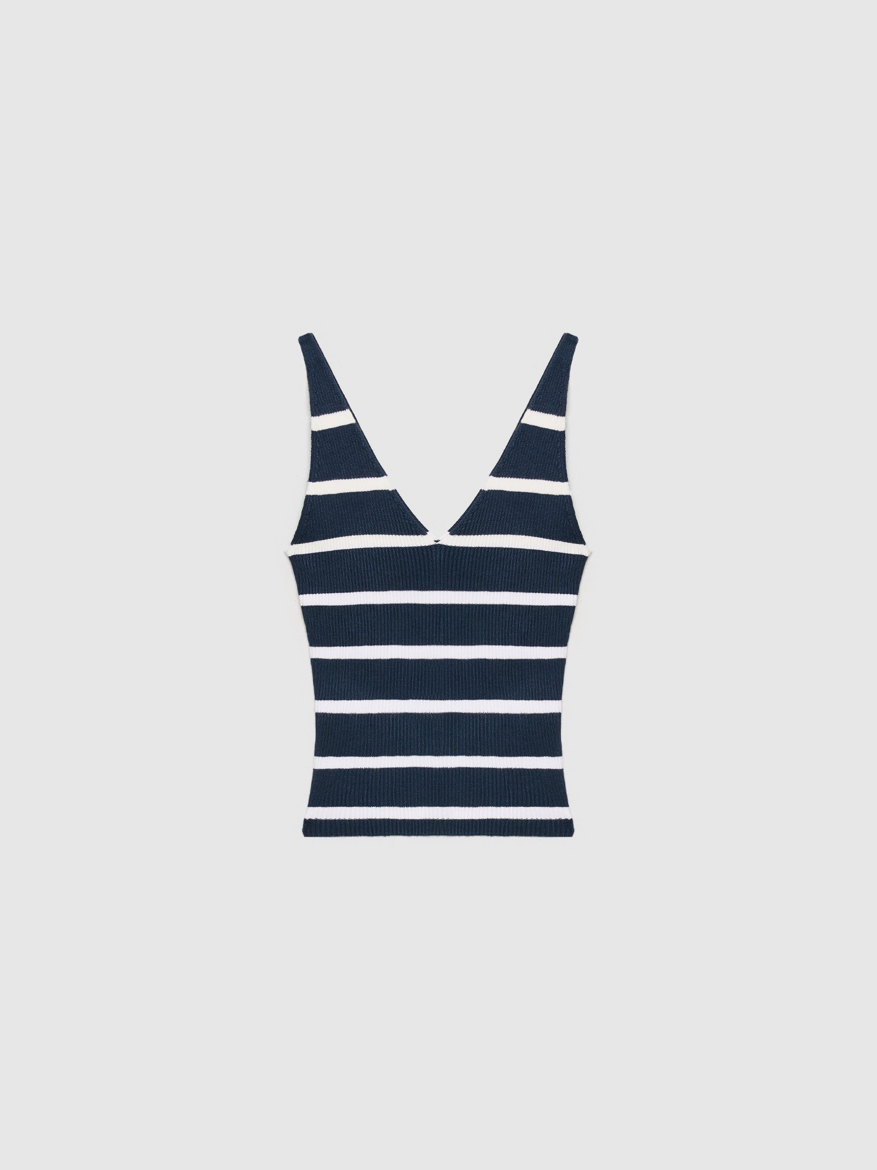 Add a summery touch to your wardrobe collection with this fitted V-neck strappy top. The fine horizontal striped design is available in a range of colours and is crafted from stretch tricot. Perfect for casual looks and sunny days.