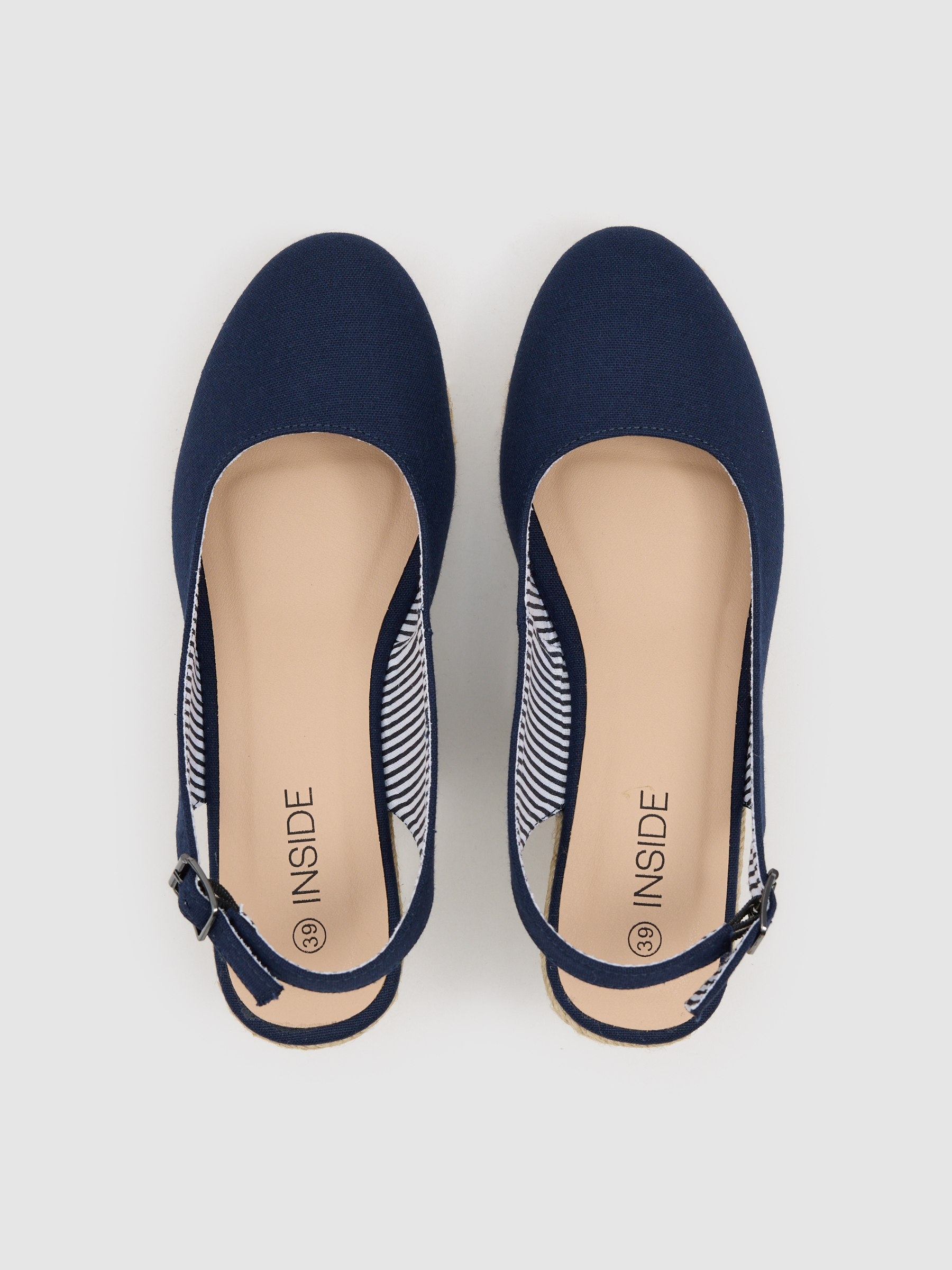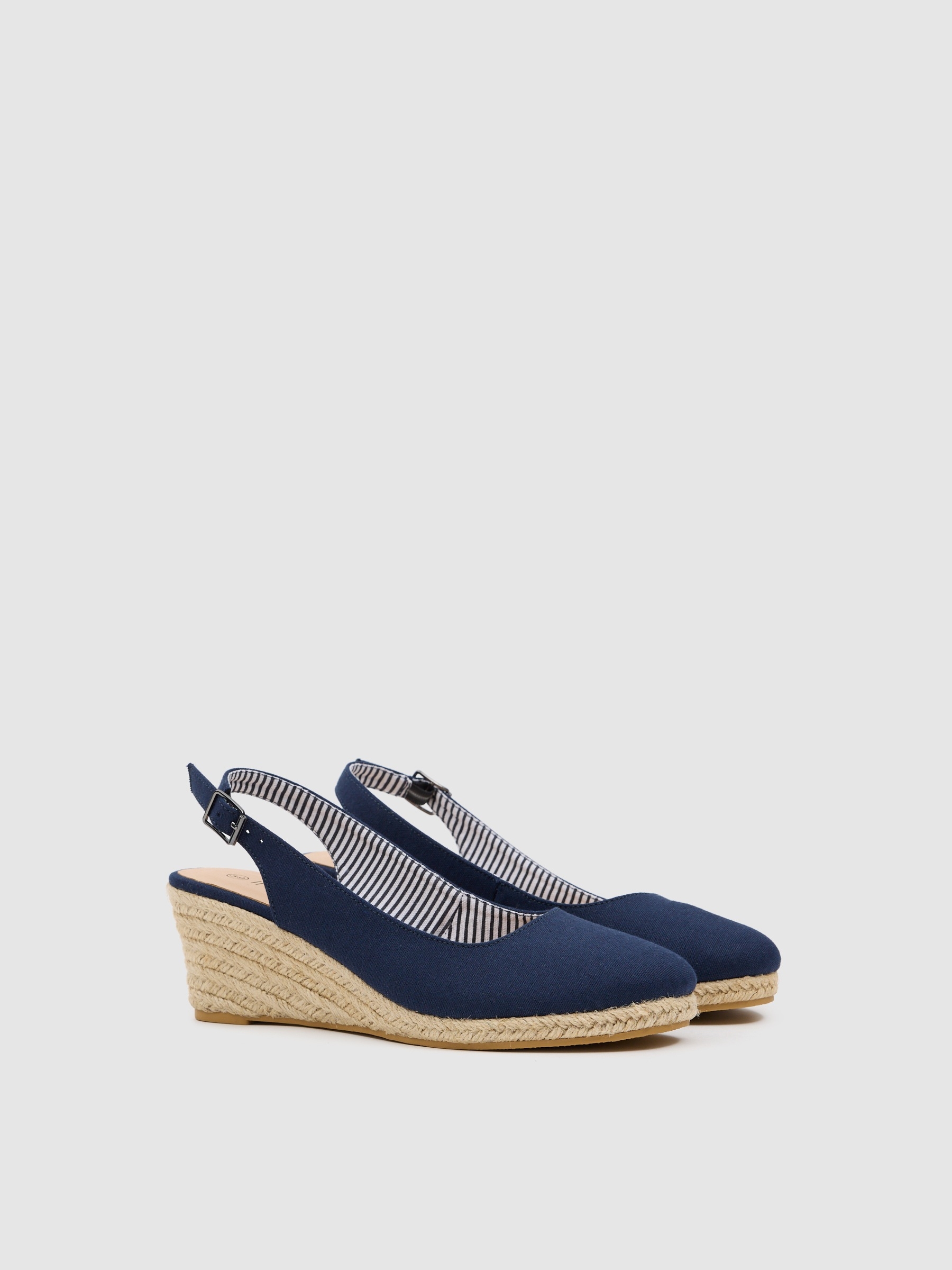 Wedge in navy blue canvas fabric with a rounded neckline design and ankle buckle closure. It features a striped inner lining and a braided jute sole with a natural finish. 8 cm heel and 2 cm platform.