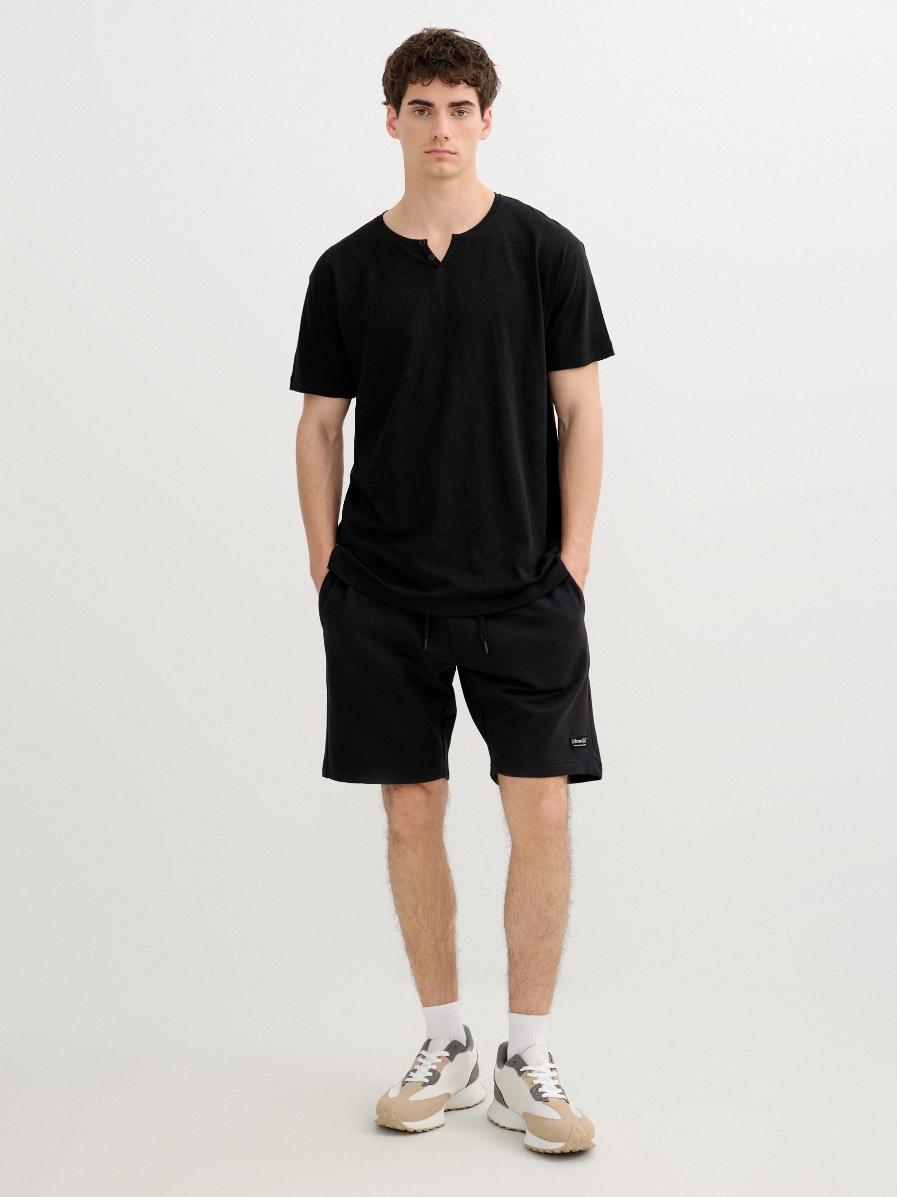 Bermuda jogger deportiva confeccionada en tejido de felpa. Cintura elástica con cordones y corte regular.