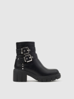 La temporada no espera, si eres de las que siempre llegan tarde y vas en busca del calzado perfecto con el que llegar a tiempo a todas partes, entonces este botín efecto piel en tono negro con tachas en el talón es para ti. Diseño con correas ajustables mediante hebilla y cierre de cremallera. Tiene suela track con tacón cuadrado de 6 cm de altura.