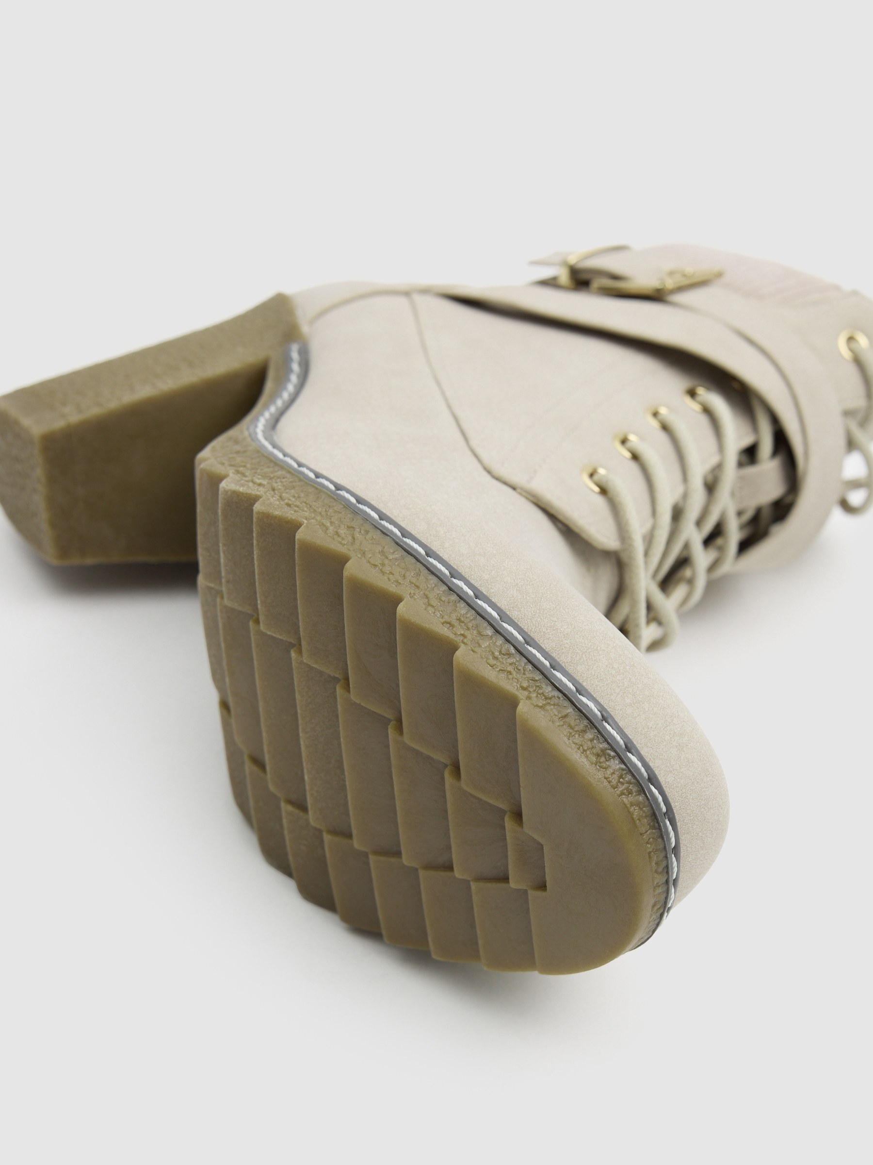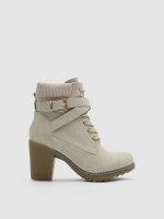 Botines de tacón confeccionado con tejido polipiel. Cierre mediante cordones delanteros y ajuste con hebilla. Suela tipo track. Acabado en punta redonda