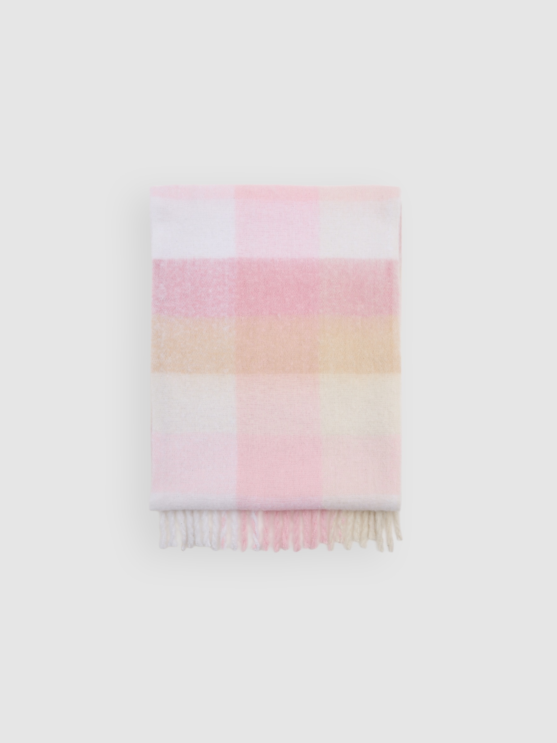 Bufanda estampada a cuadros en tonos pastel y acabados con flecos a tono. Medidas: 190 x 42 cm.