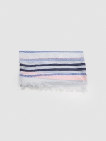 Fular con diseño de rayas en tonos pastel y detalles en azul marino. Confeccionado en tejido suave, acabado con flecos en los bordes. Ideal para añadir un toque de color a tu look.