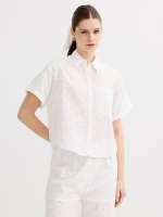 Camisa de manga corta con cuello clásico y cierre de botones, confeccionada en tejido con bordado suizo y estampado liso. Diseño oversized.