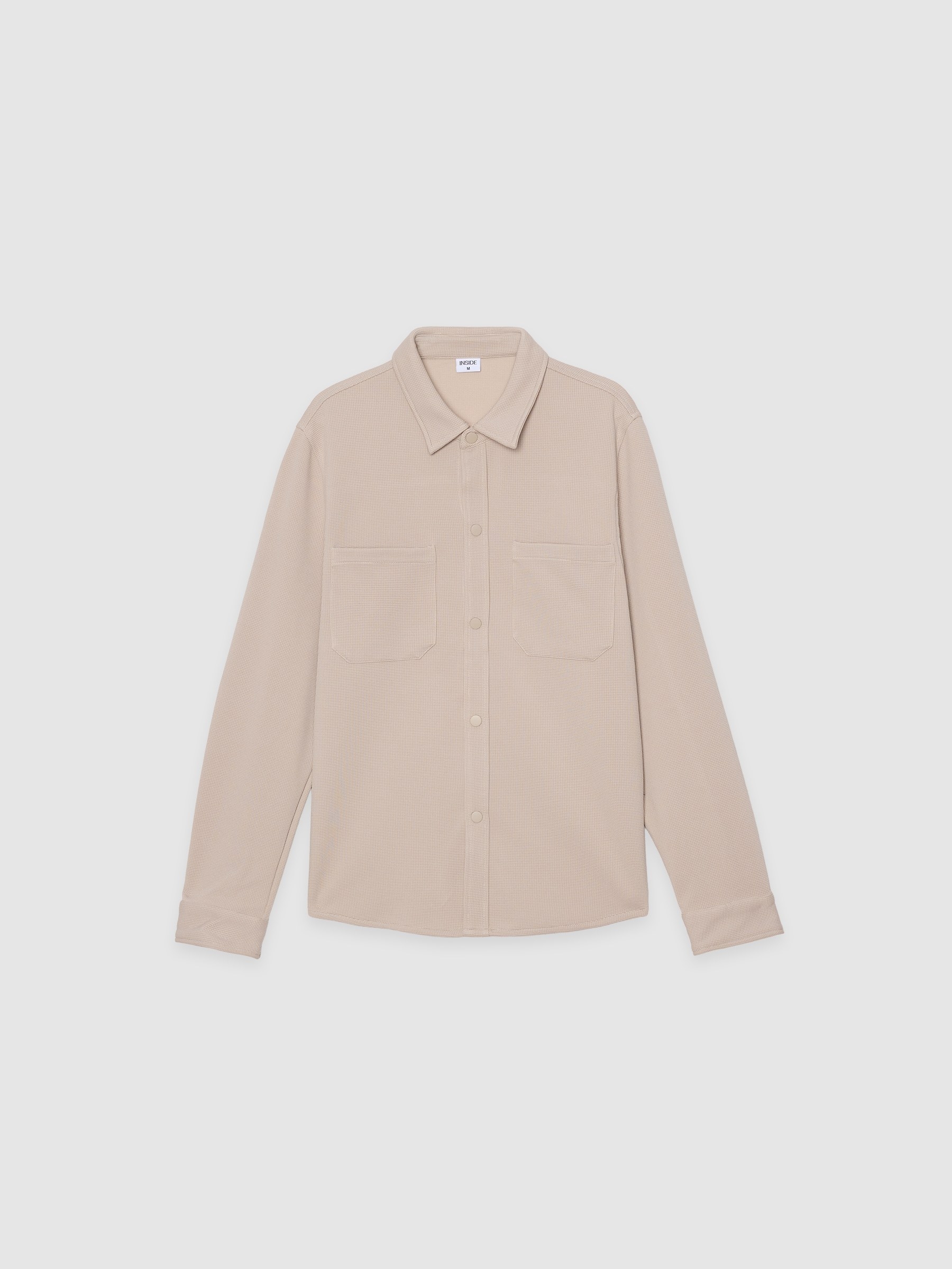 Camisa de manga larga con extura. De estampado liso y cuello clásico. Con bosillos grandes delanteros y cierre mediante botones frontales.