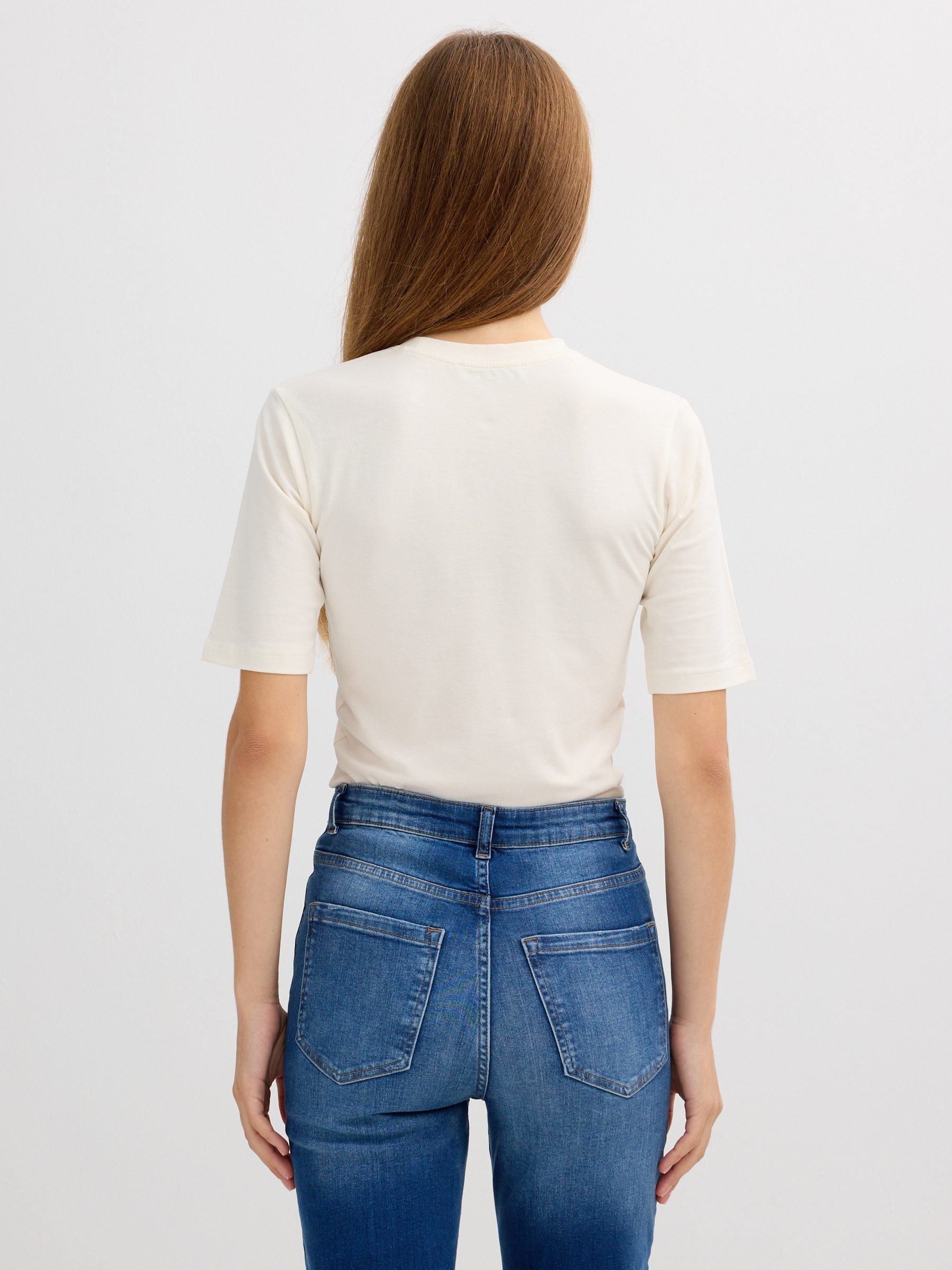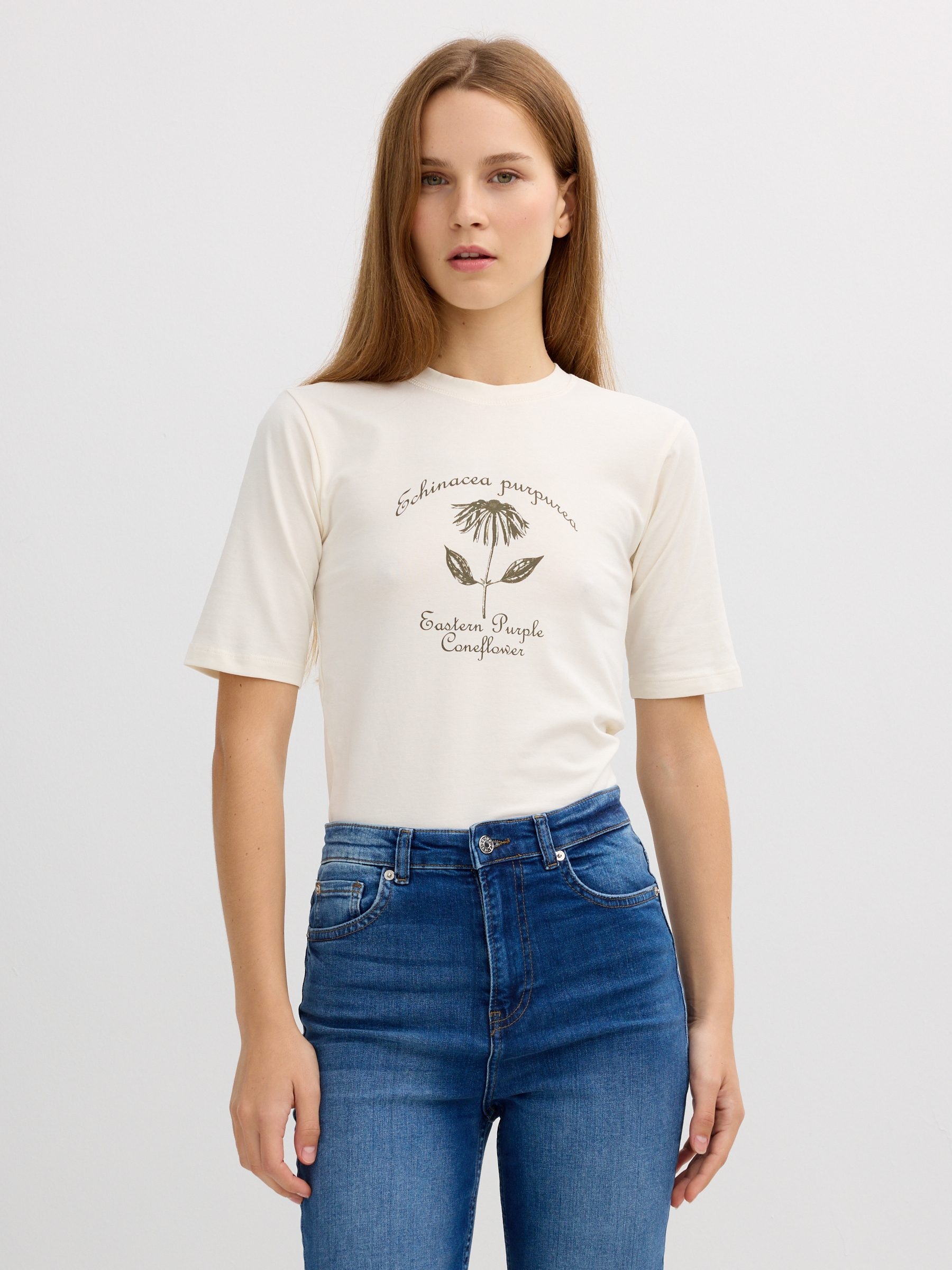 Camiseta confeccionada con algodón y elastano, de manga hasta el codo y cuello redondo. Diseño frontal con imagen y texto en tonos naturales.
