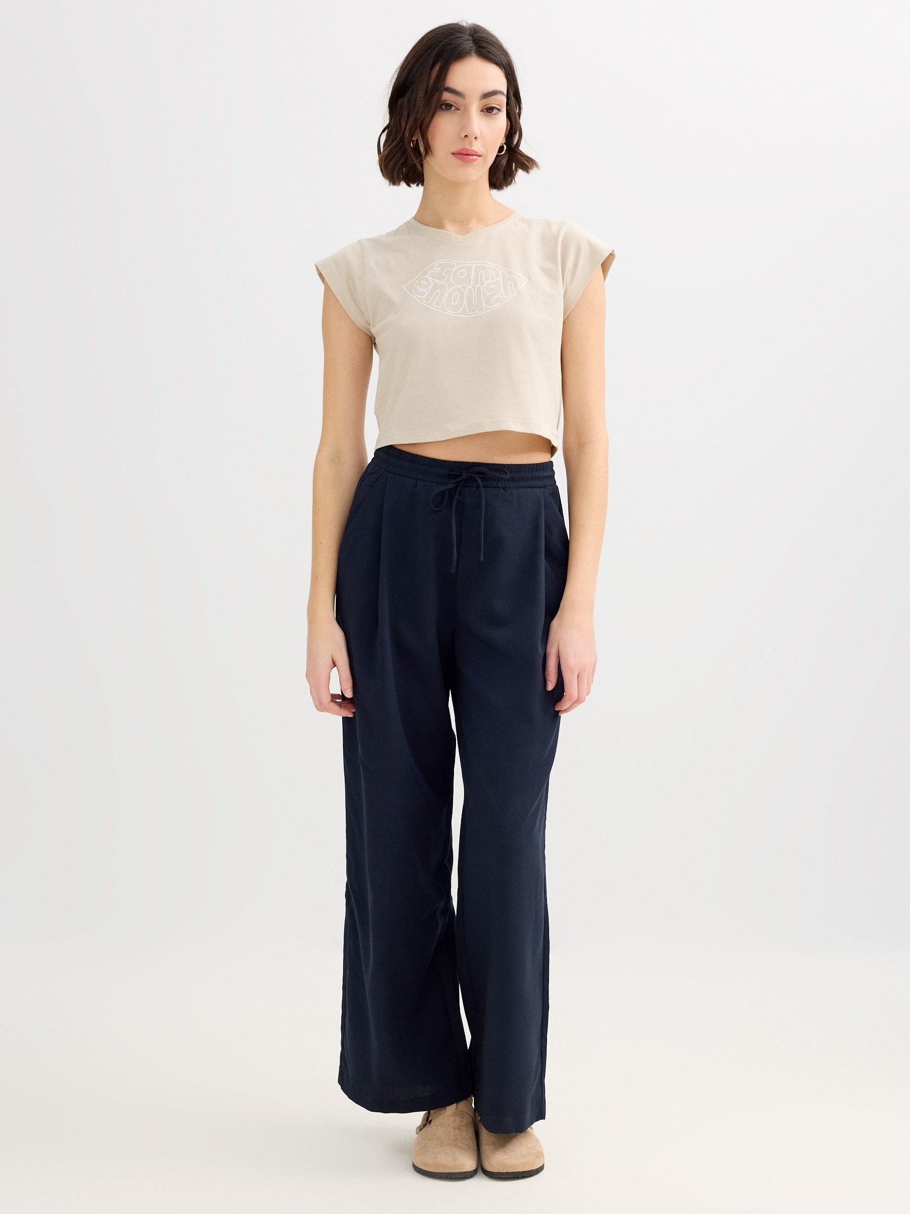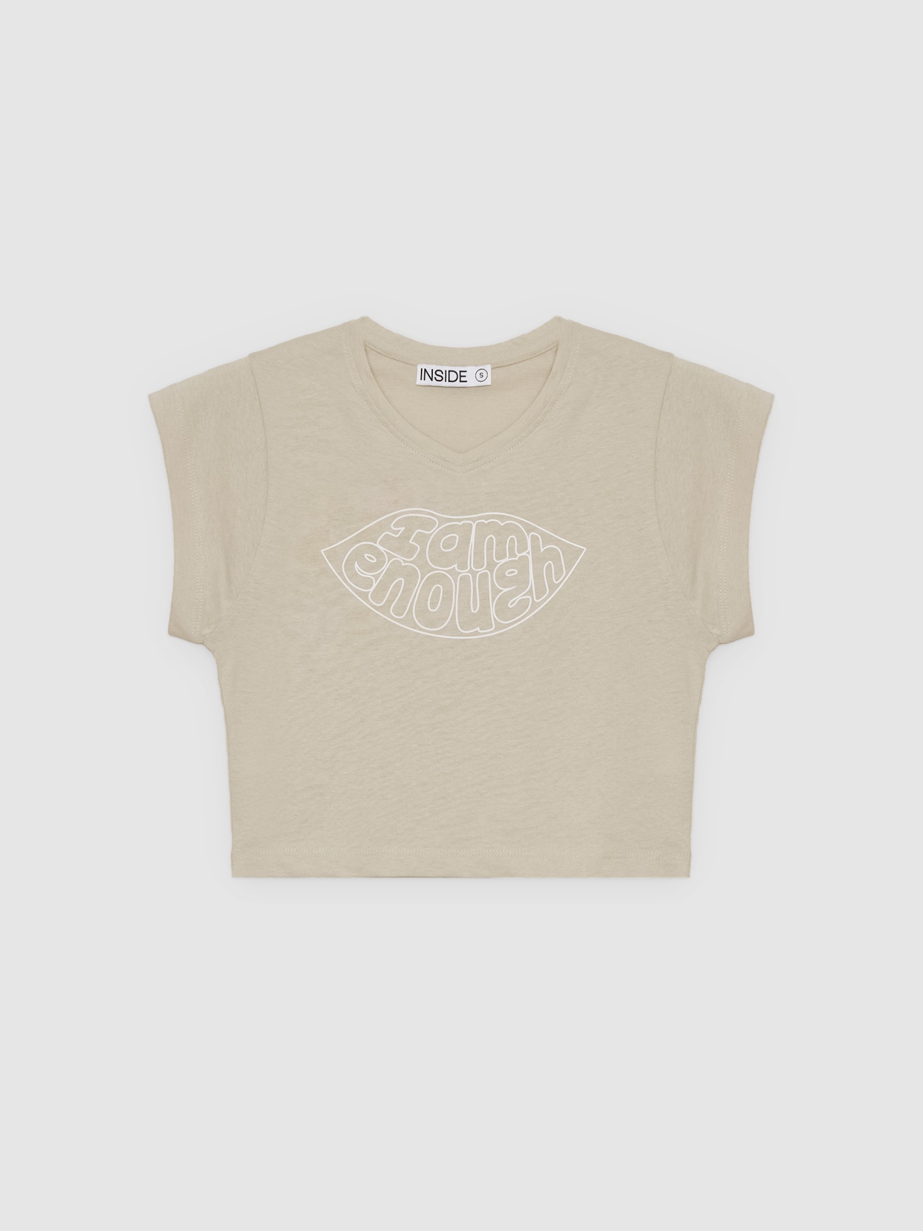 Camiseta de manga corta con estampado de lettering en la parte frontal, confeccionada en tejido de algodón. Corte crop cuadrado y cuello pico.