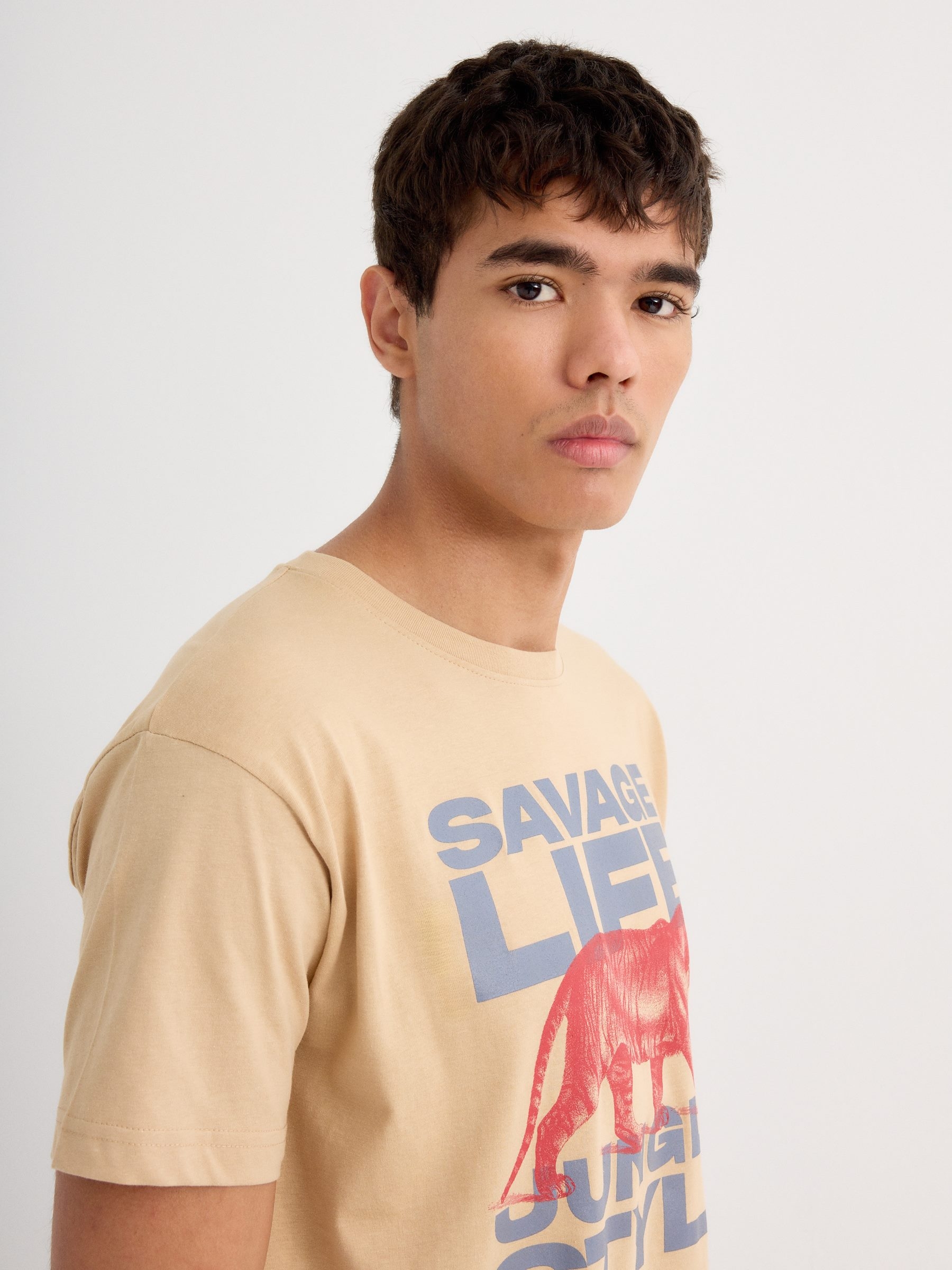 Camiseta de manga corta Savage Life. Con cuello redondo y corte recto, ofrece un ajuste cómodo y versátil. Su diseño destaca por un estampado llamativo con texto y un tigre. Confeccionada en algodón, garantiza suavidad y transpirabilidad, ideal para looks urbanos con personalidad.