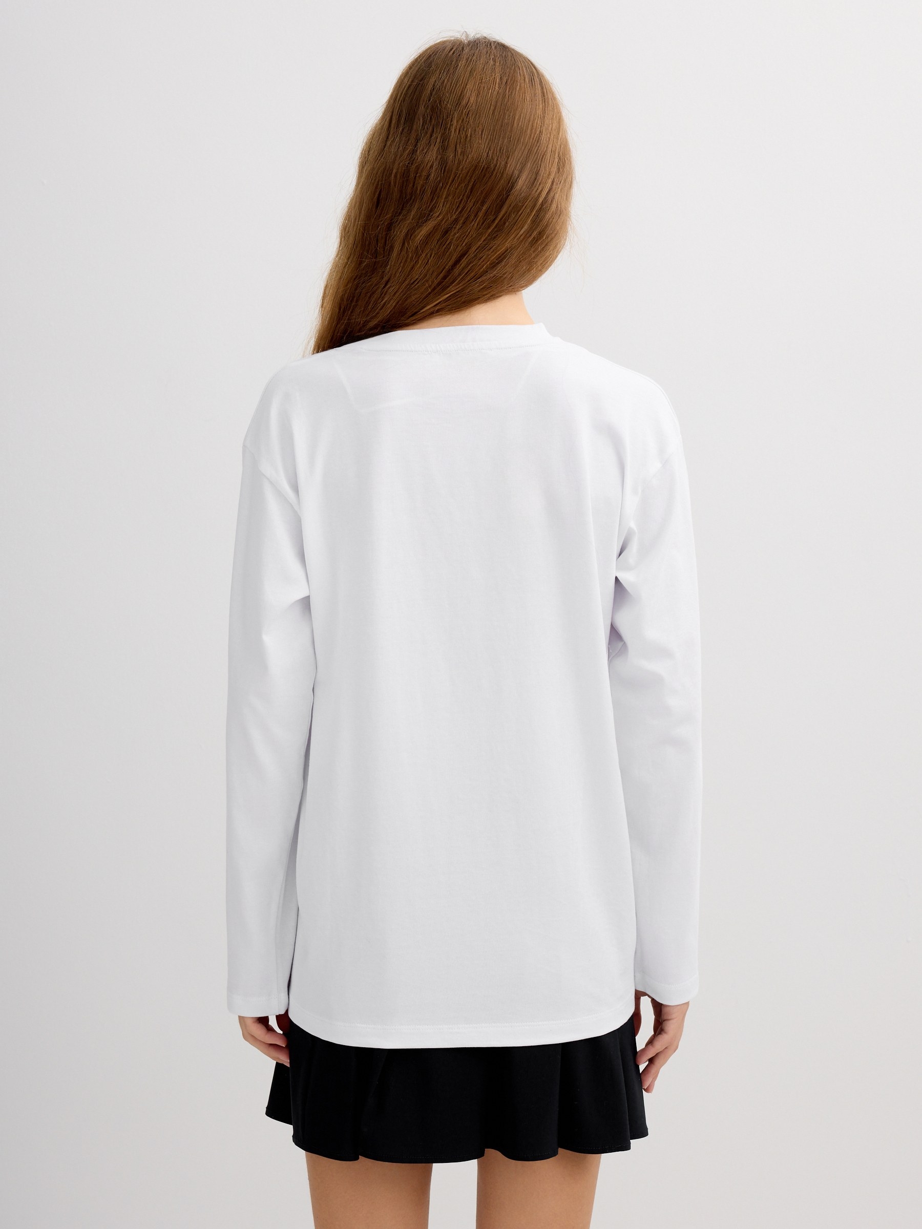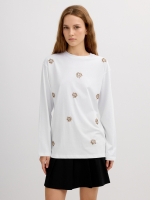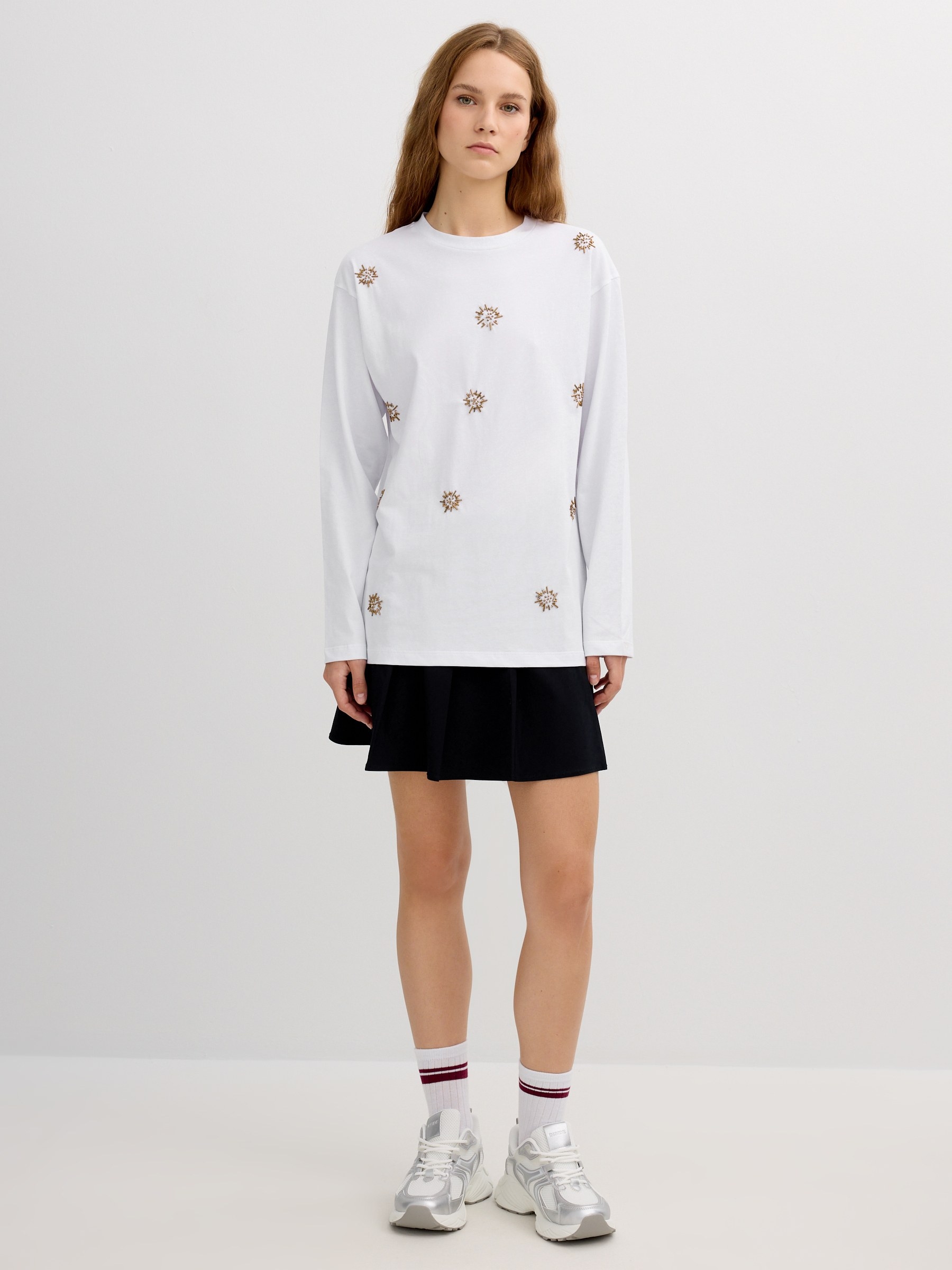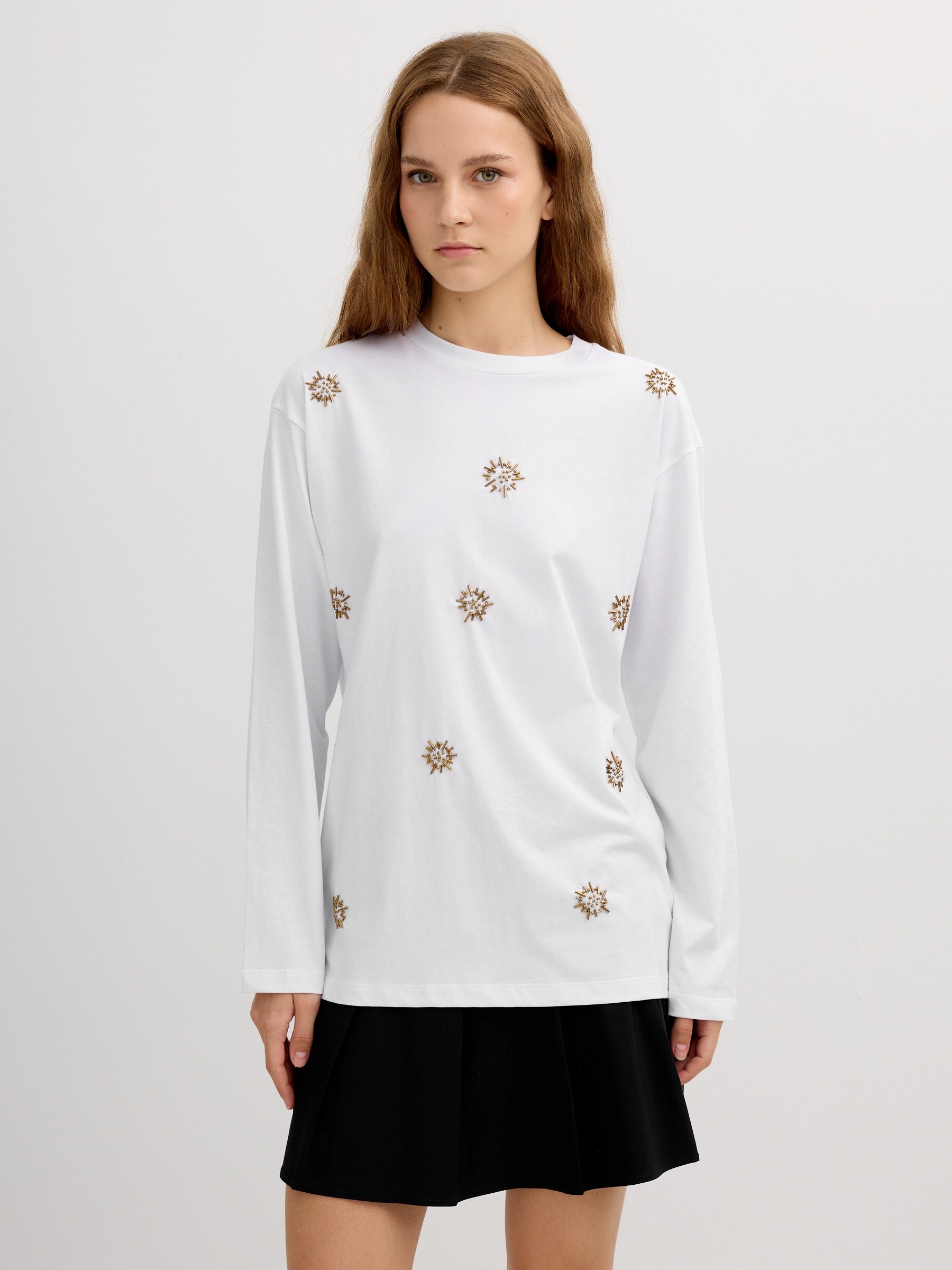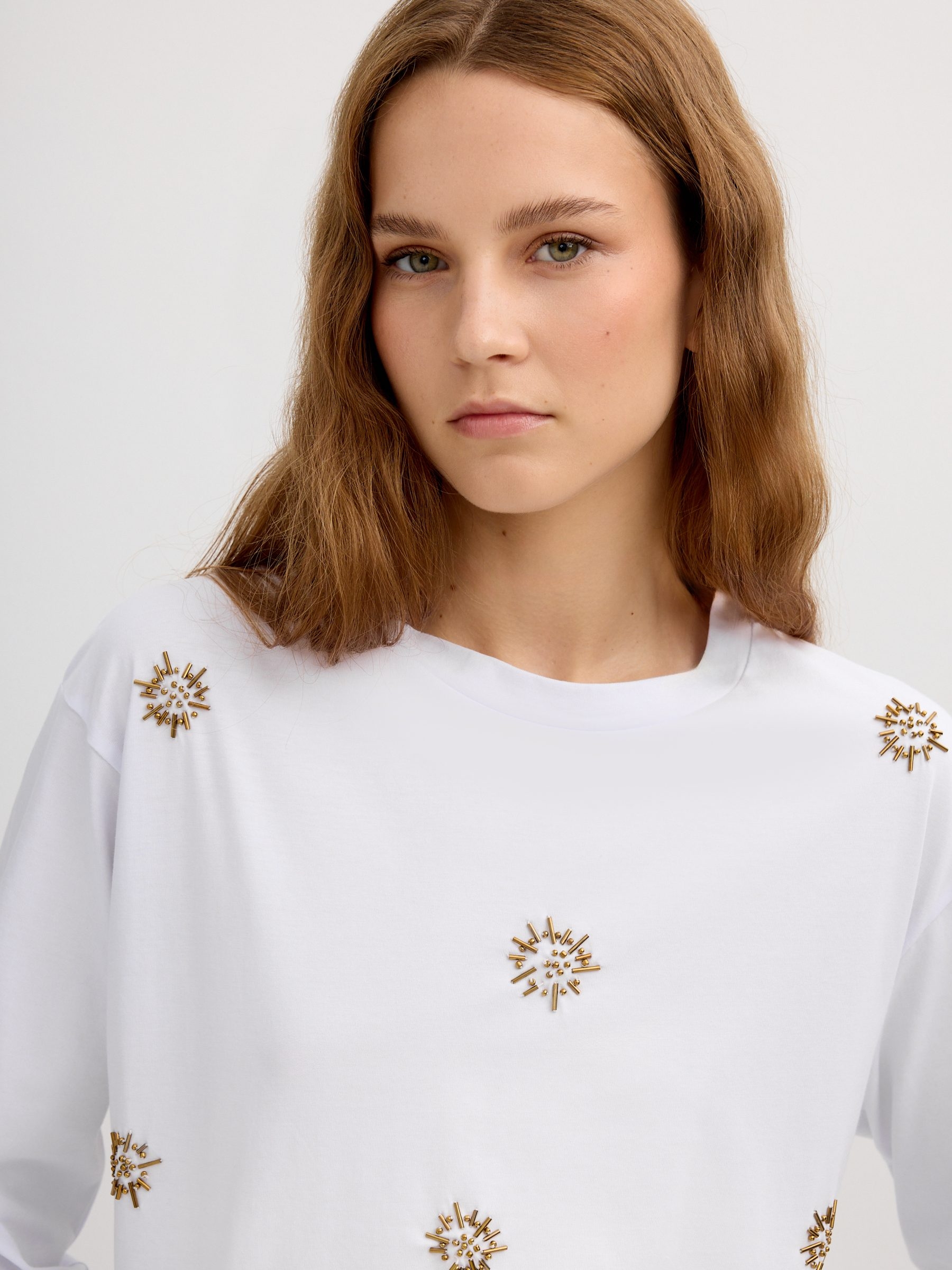 Camiseta de manga larga 100% algodón con detalles de abalorios. Cuello redondo y corte regular.