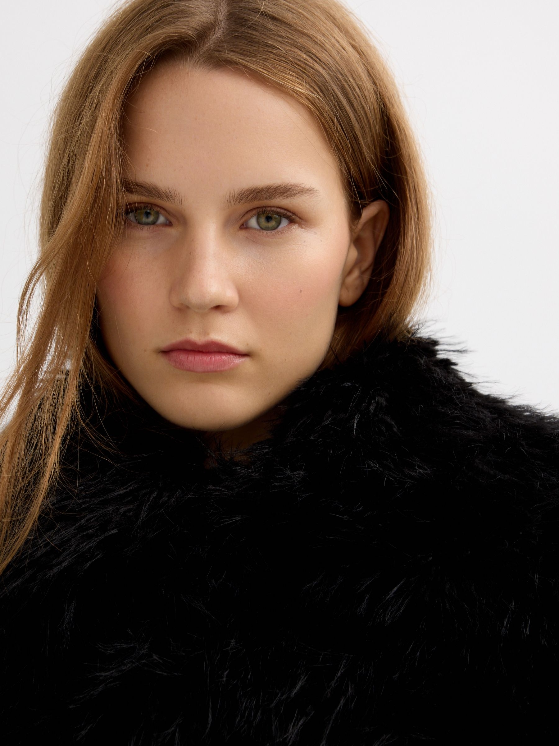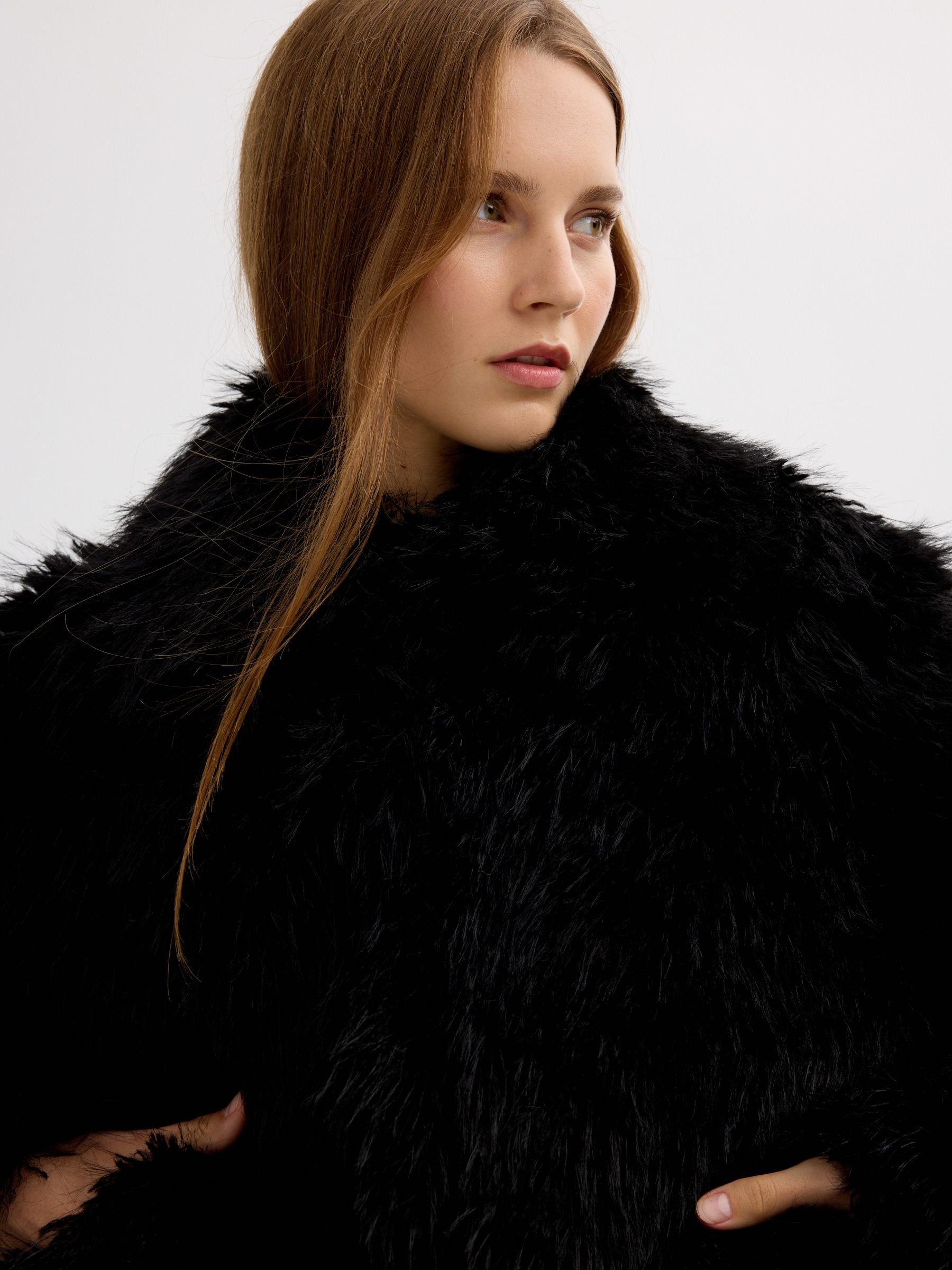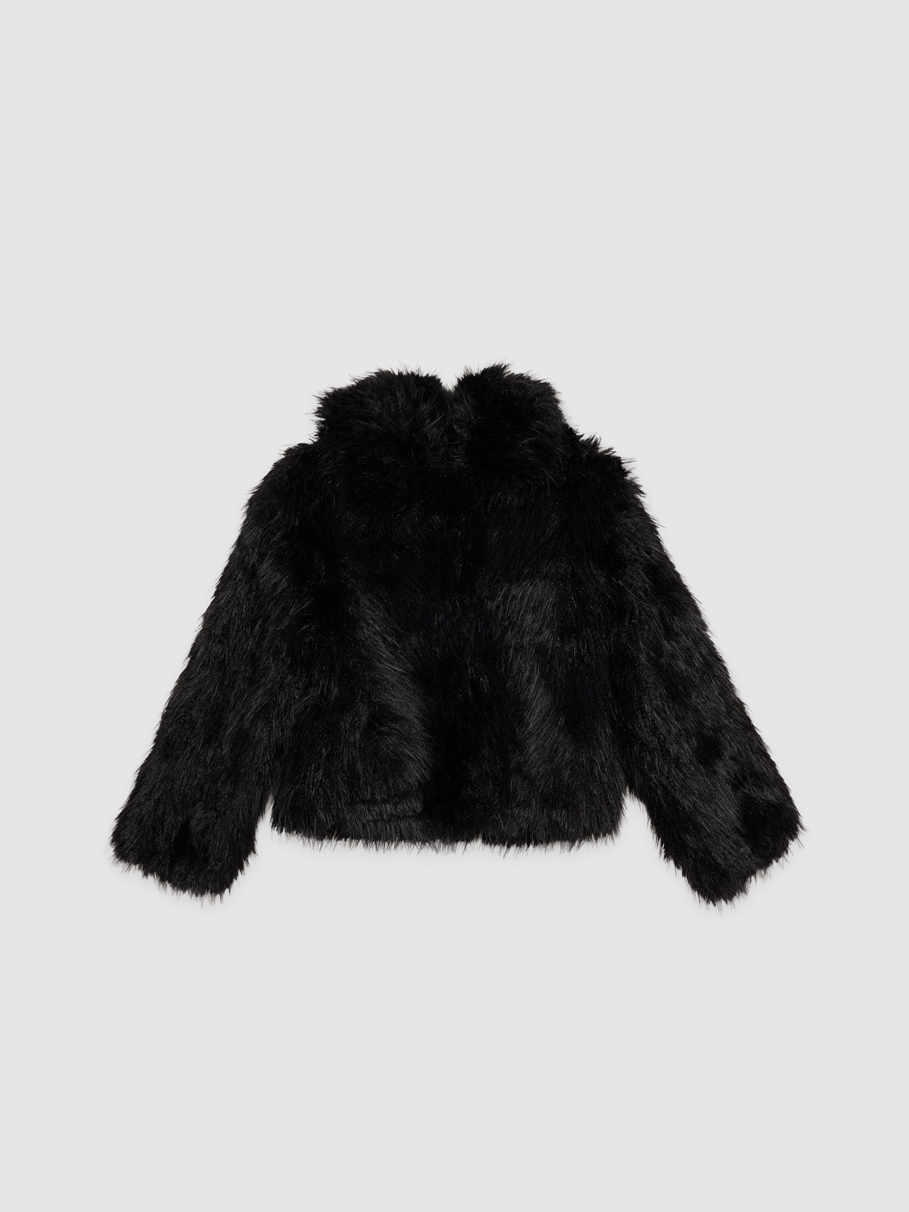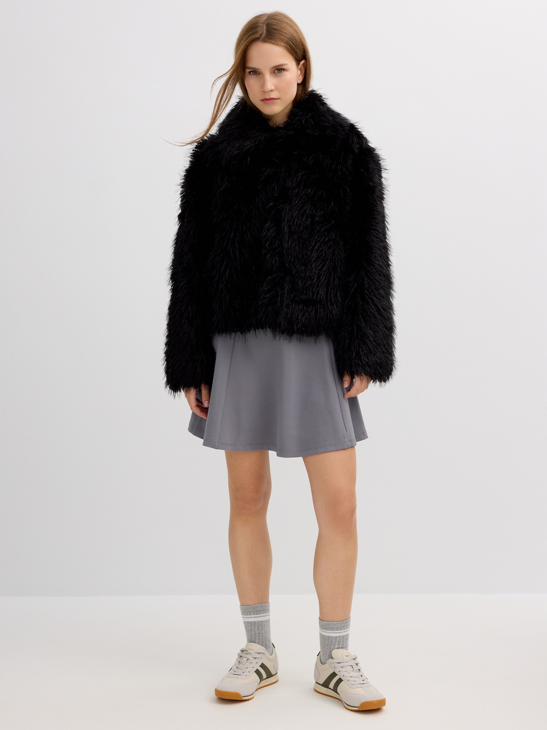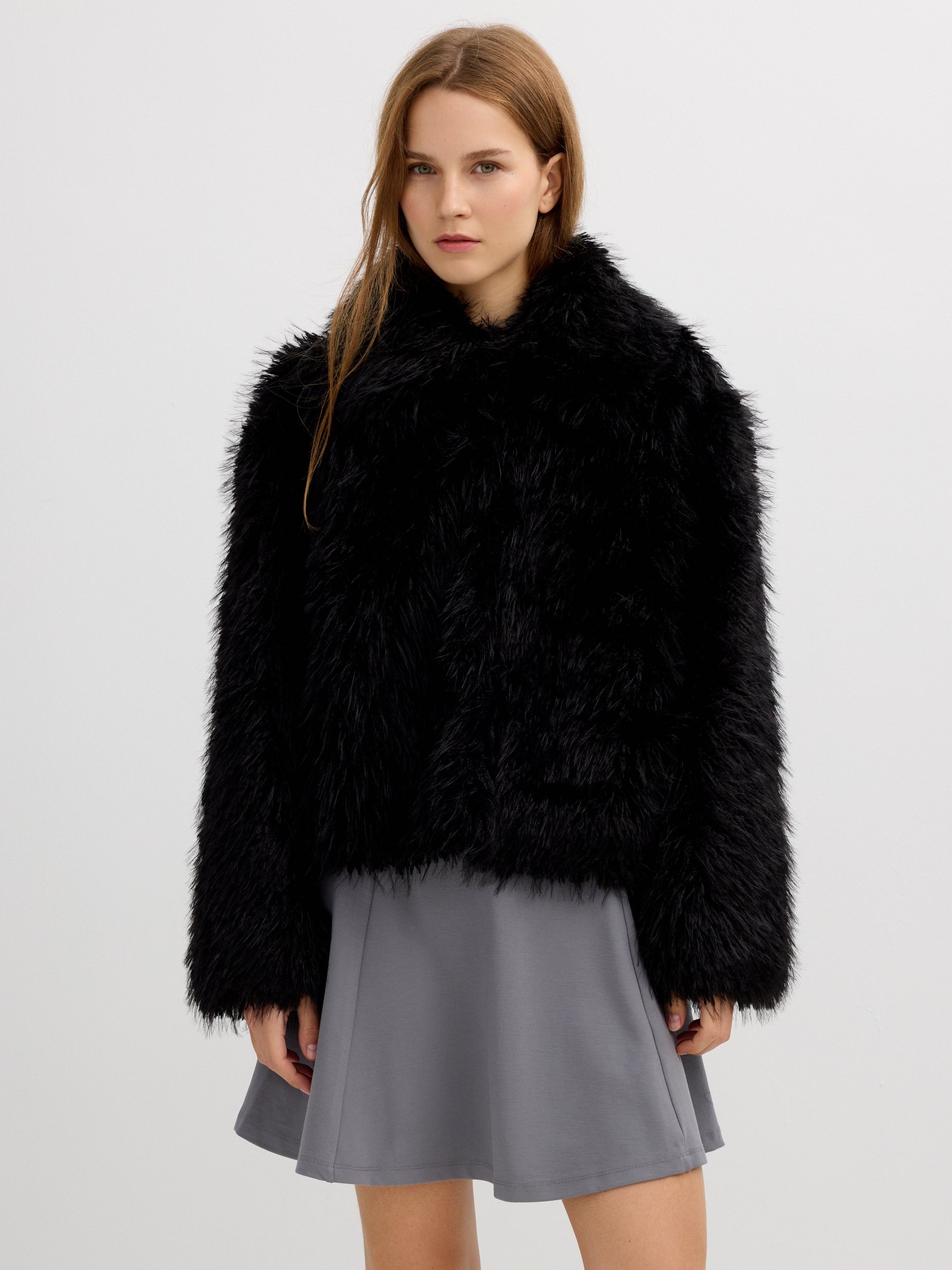 Cazadora corta confeccionada con tejido de efecto pelo. Cuello solapa y corte regular. Bolsillos laterales. Cierre frontal mediante corchetes.