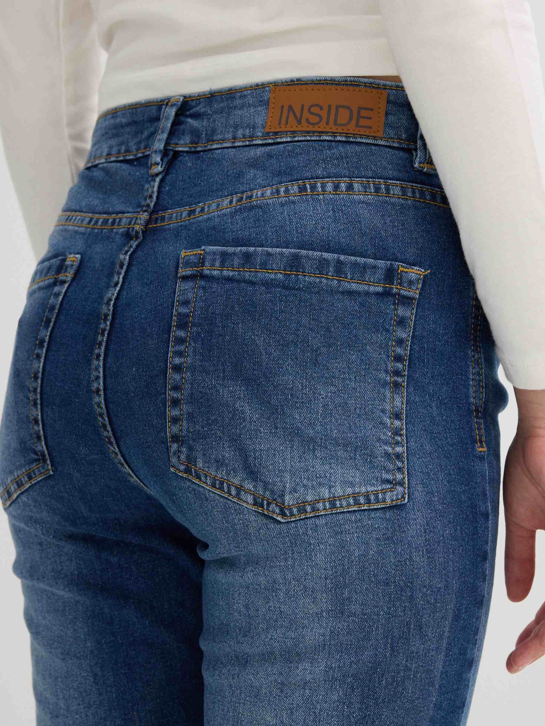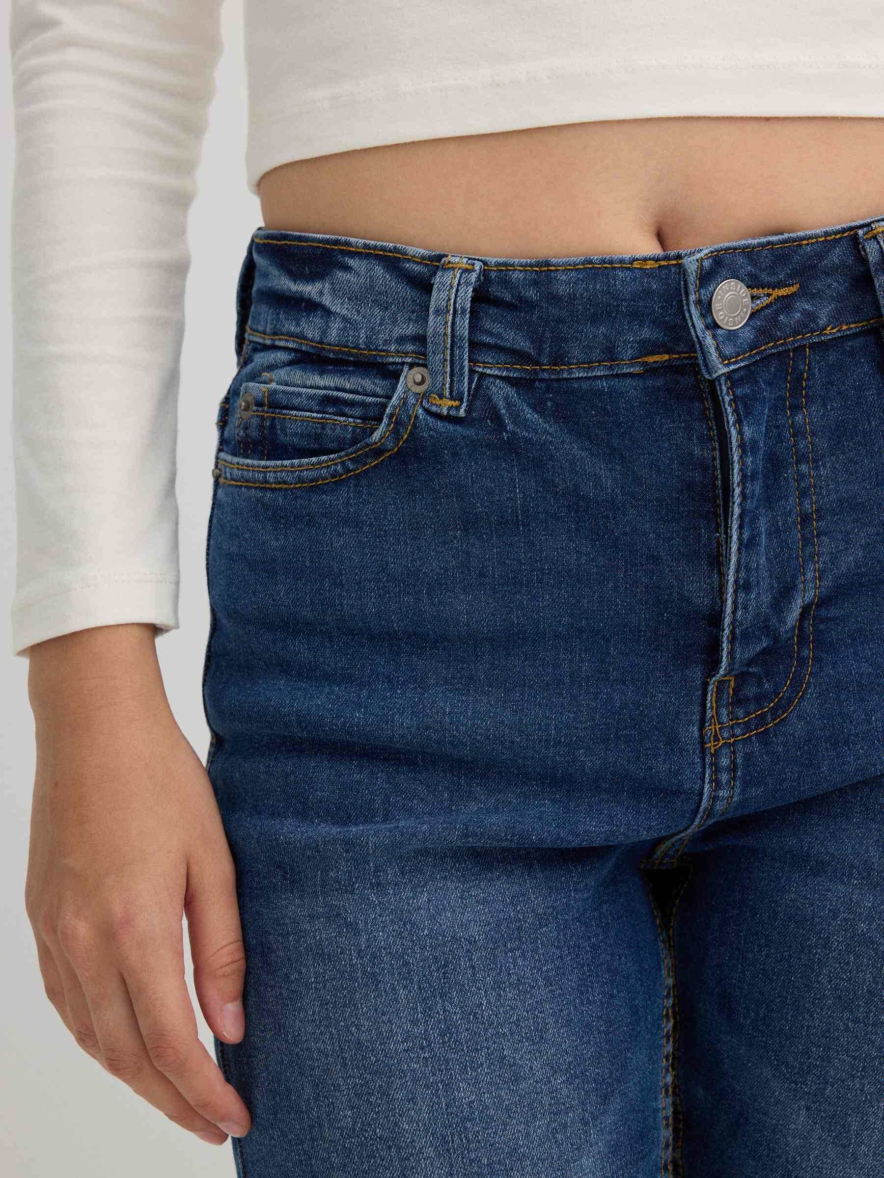 Jeans de tiro medio con trabillas y cinco bolsillos. Cierre frontal con cremallera y botón metálico. Confeccionado con algodón y elastano aportando comodidad y elasticidad.