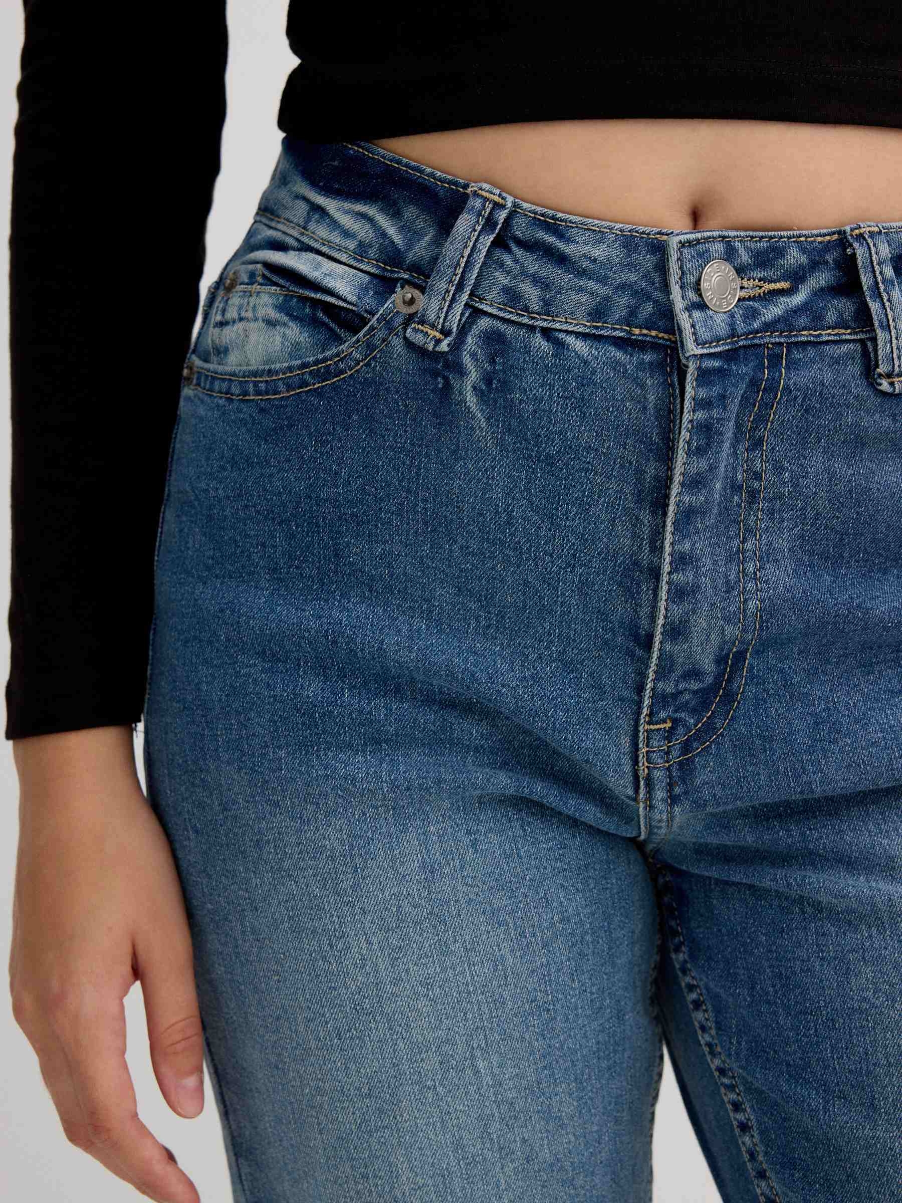 Jeans de tiro alto con trabillas y cinco bolsillos. Cierre frontal con cremallera y botón metálico. Confeccionado con algodón y elastano aportando comodidad y elasticidad.