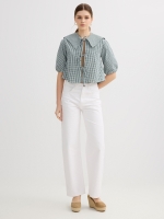 Pantallón de tiro alto confeccionado en tejido de algodón con bordado suizo y acabado liso. Diseño fluido y pernera wide leg y cierre elástico.