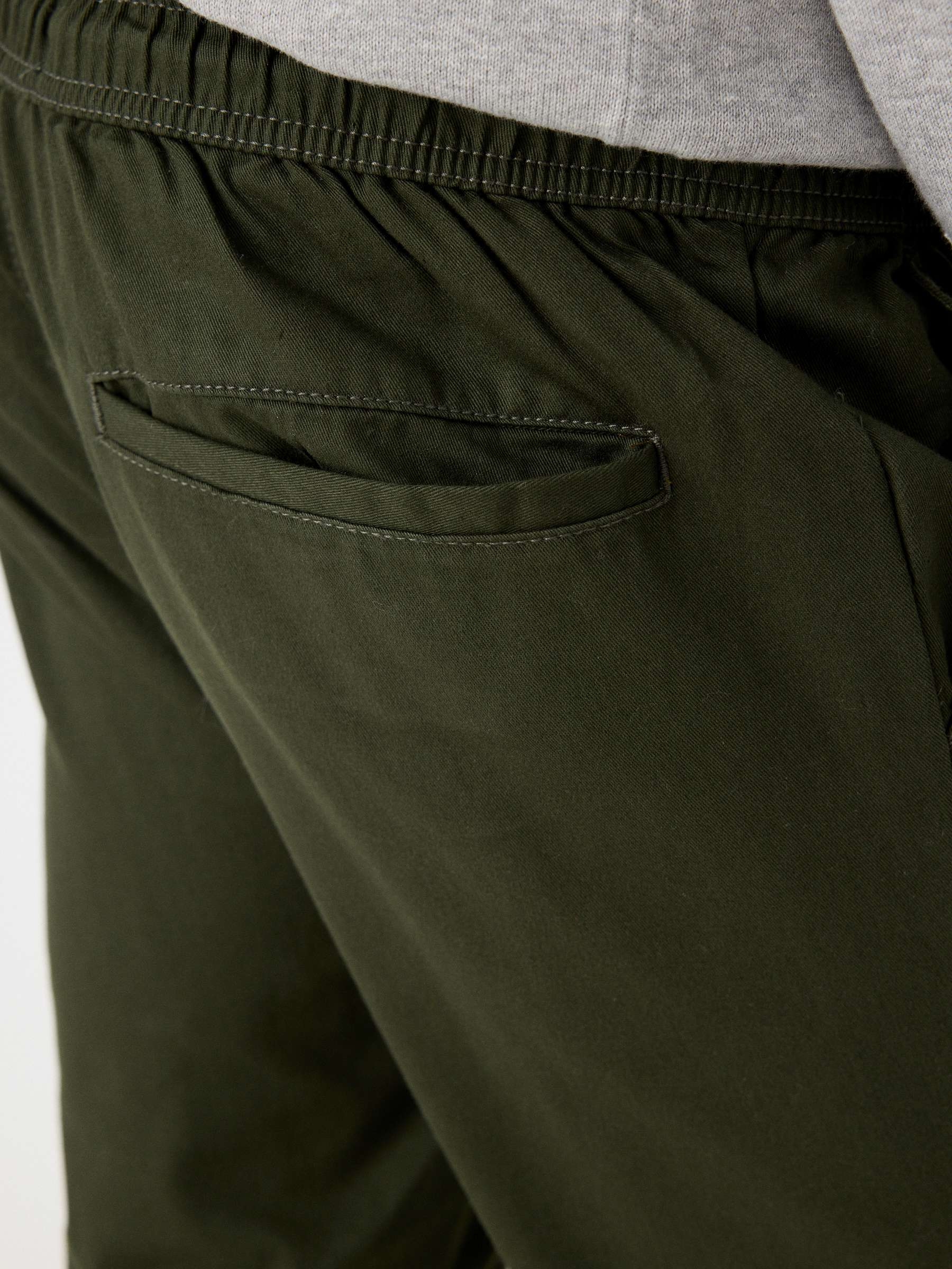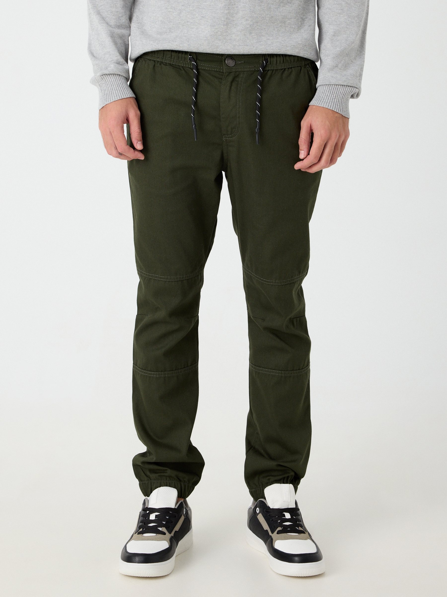 Pantalones jogger de color con costuras marcadas en la pernera. Bolsillos laterales y bolsillo trasero. Bajo con puños elásticos. Cierre de botón y cremallera. Cintura elástica ajustable mediante cordón.