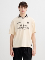 Polo de manga corta en tejido single jersey, con cuello clásico y cierre de botones. Estampado de texto y detalles gráficos.