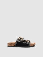 Sandalia bio plana con tiras en efecto piel y pespuntes decorativos en contraste. Incorpora doble hebilla metálica y suela de goma con acabado tipo corcho.