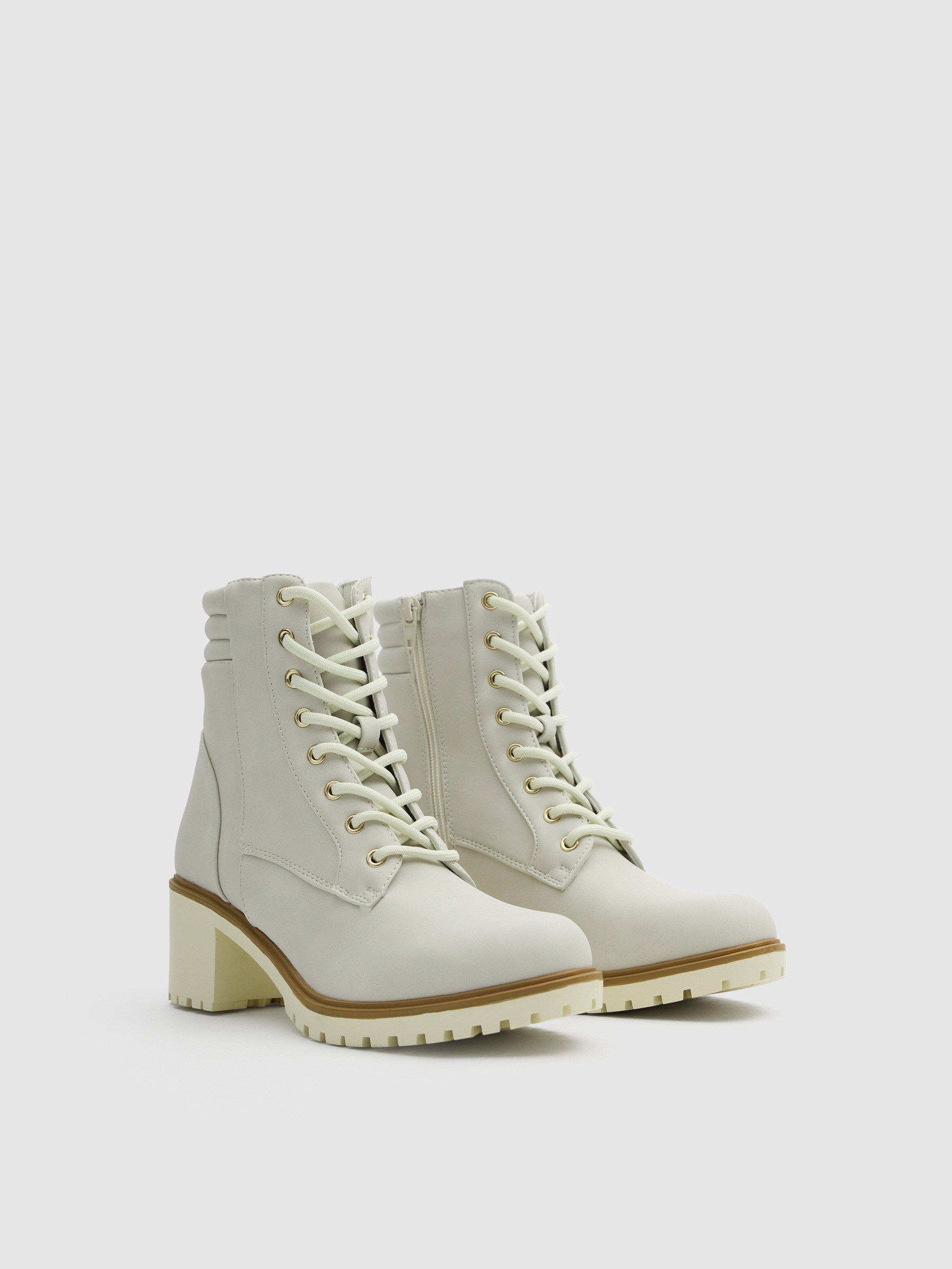 Botins de salto alto com atacadores na parte dianteira. Fecho através de fecho de correr lateral. Sola tipo track. Acabamento em bico redondo.