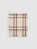 Cachecol estampado aos quadrados em tons bege e castanhos. Acabamentos desfiados a condizer.