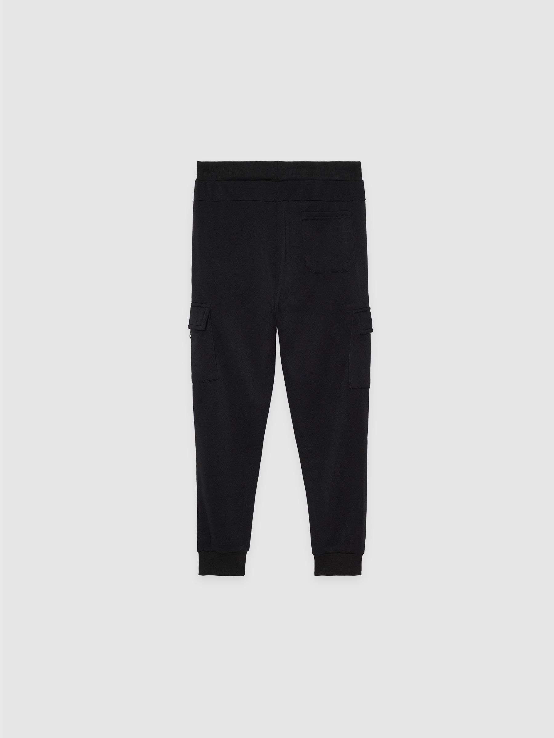 Calças jogger desportivas com design liso, confeccionadas em tecido de felpa com cinco bolsos. Fecho através de cintura elástica ajustável com cordões. Acabamentos em borracha elástica.