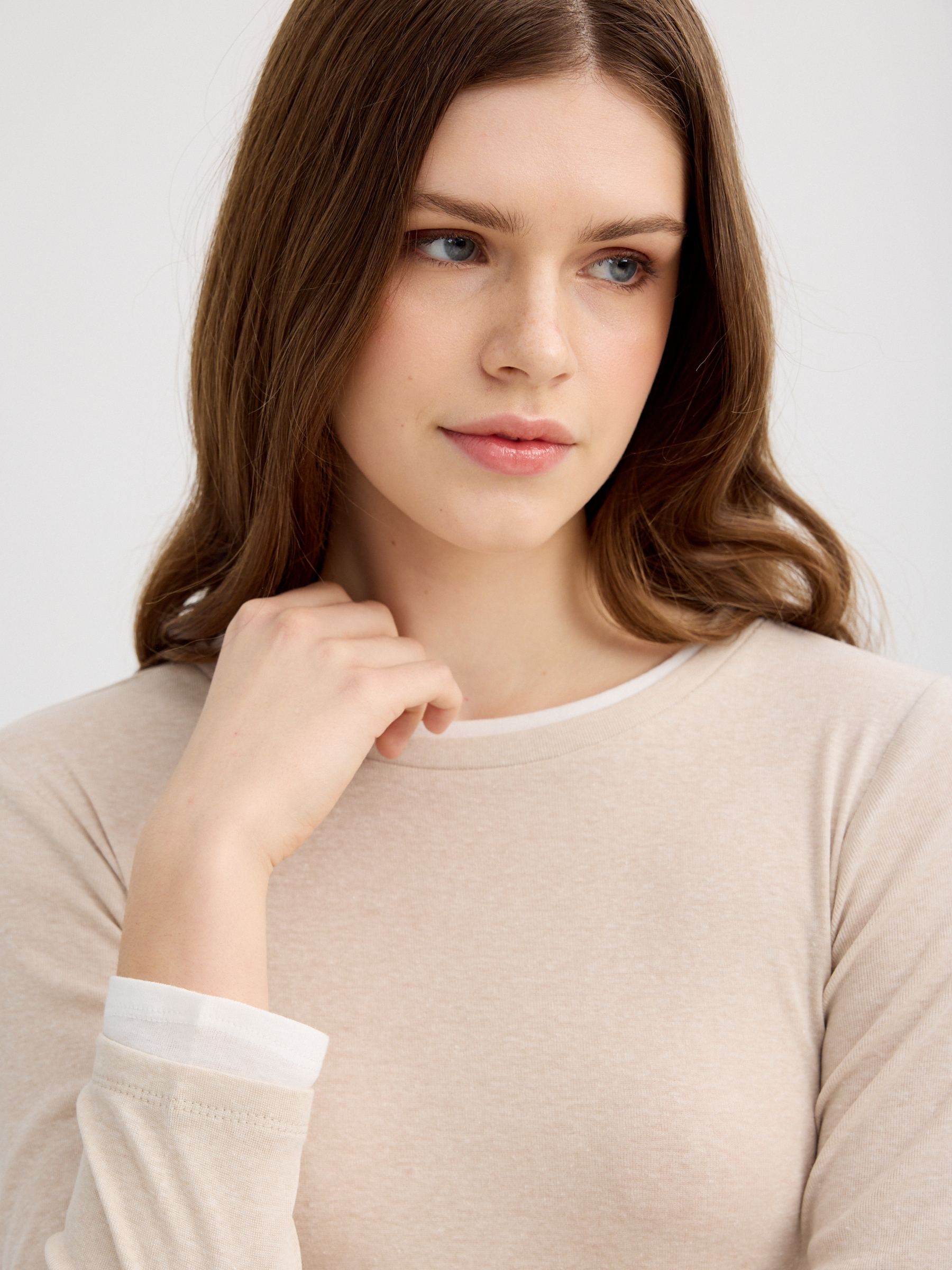 Camiseta de manga comprida em tom bege com decote redondo e acabamento em efeito de dupla camada. O design incorpora bainha e punhos brancos em contraste. Corte ajustado e tecido suave.