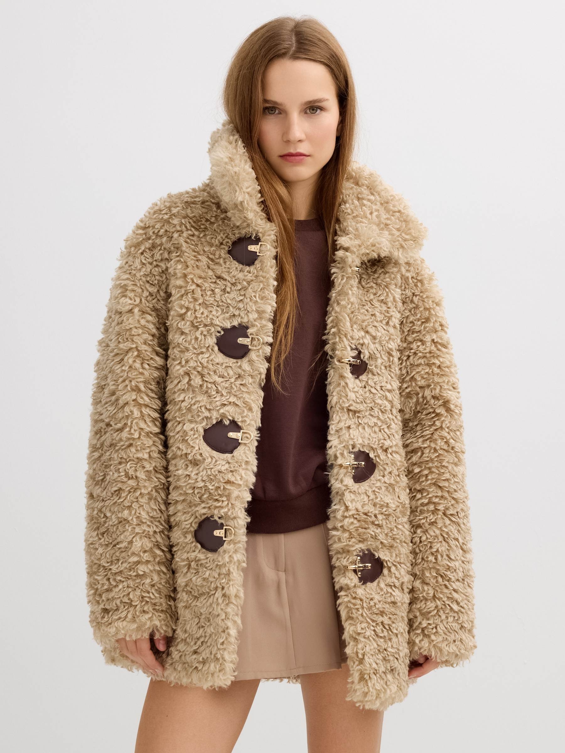 Casaco de tecido exterior efeito pelo. Manga comprida e bolsos frontais. Fecho frontal com alamares metálicos.