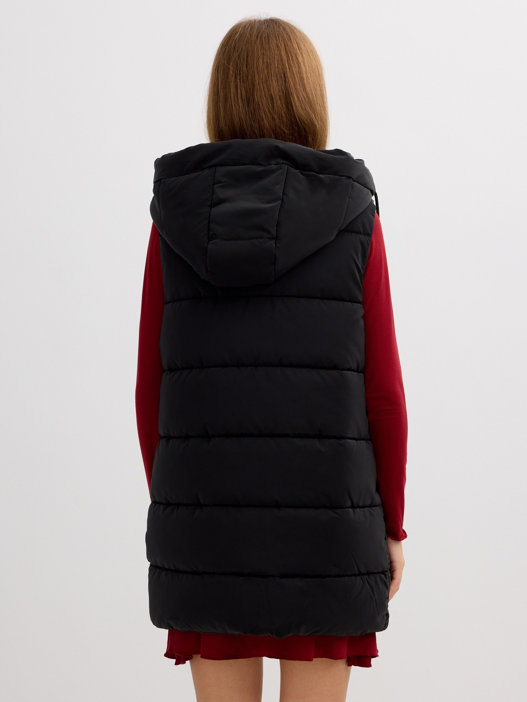 Colete acolchoado com capuz ajustável com cordões e manga cava. Bolsos frontais com fecho de correr. Fecho frontal com fecho de correr e molas.