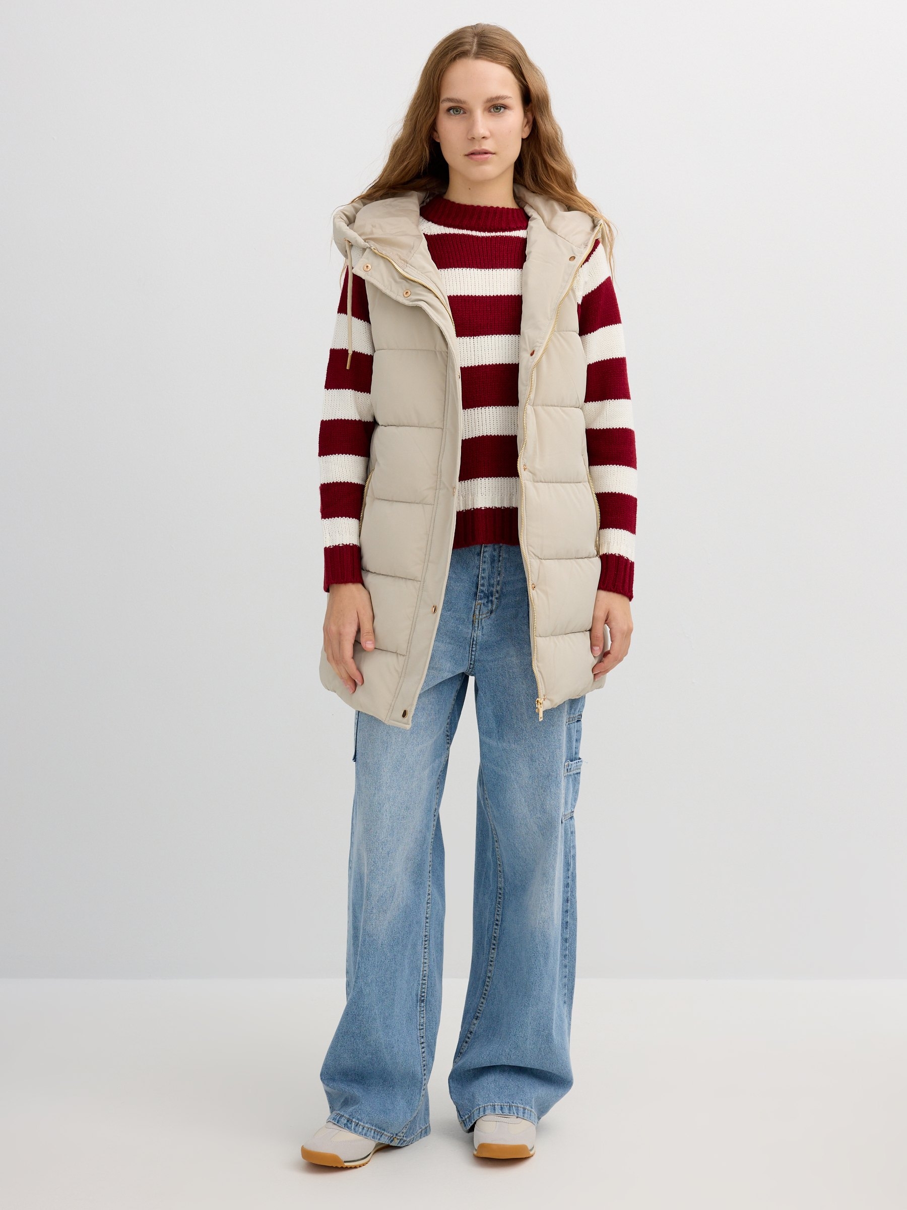 Colete comprido acolchoado com capuz