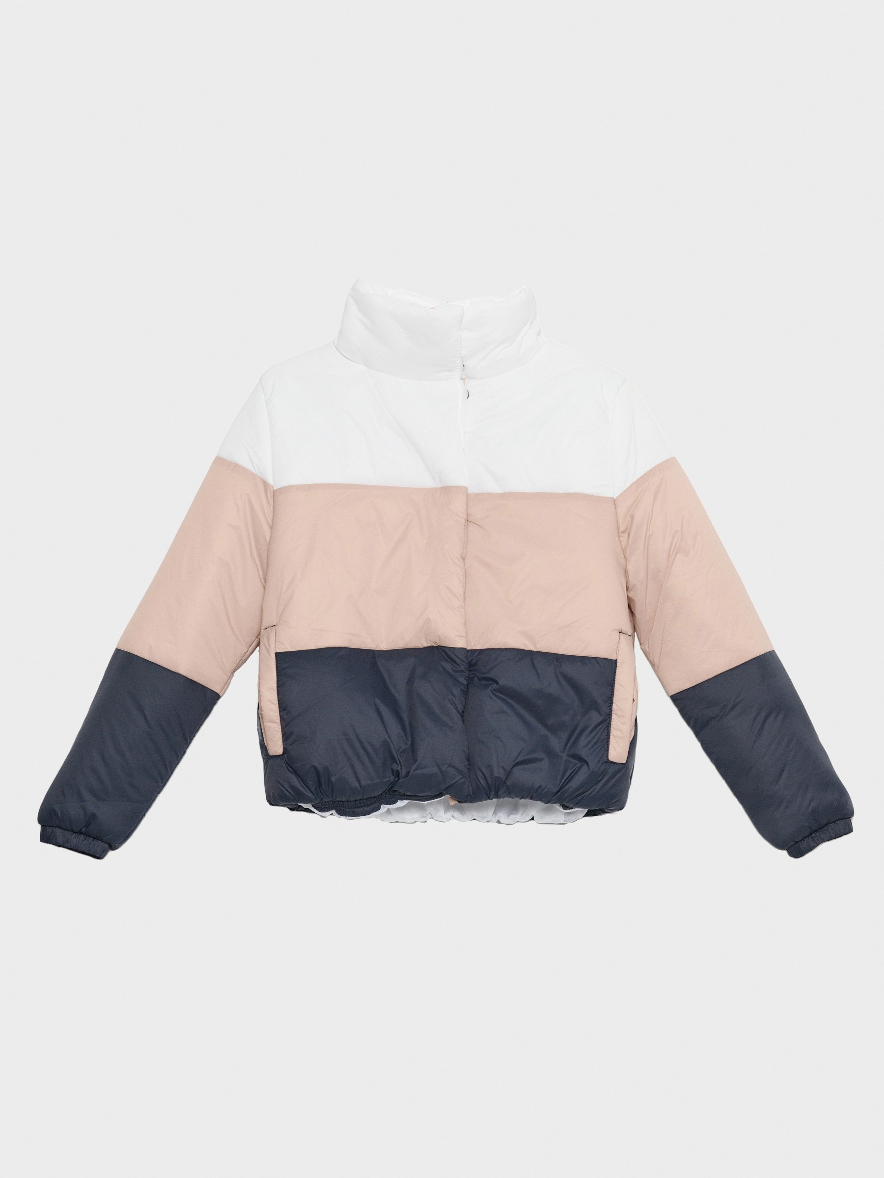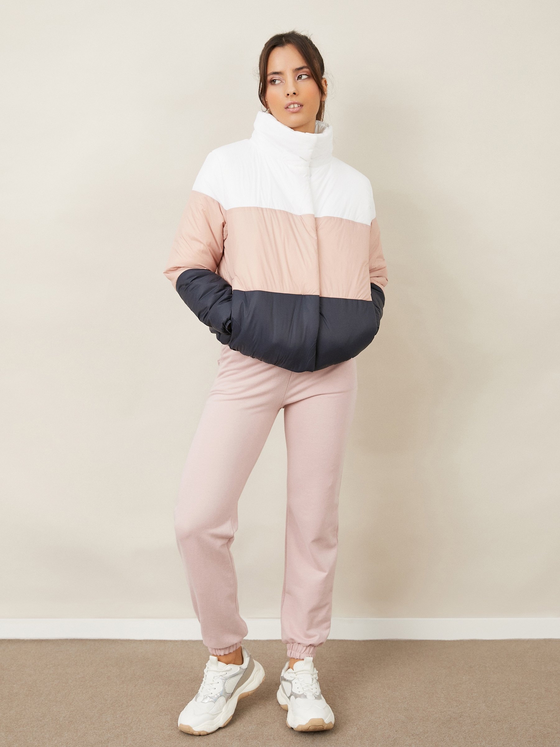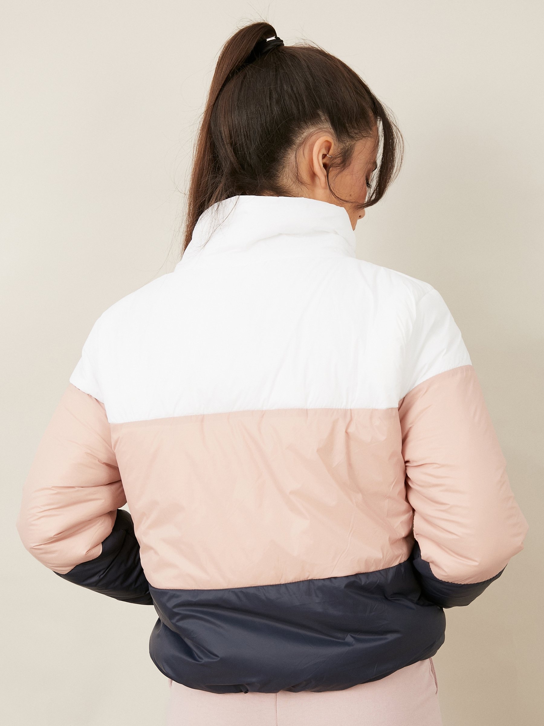 Casaco acolchoado, em tecido com desenho de painéis em cores combinadas, punhos e bainha com elástico justo, bolsos laterais, gola alta com botões de pressão e fecho de correr frontal.